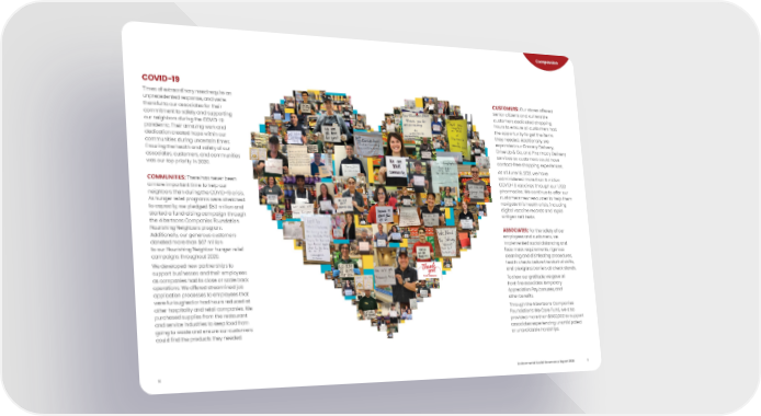 AS S O C I ATE S : For the safety of our employees and customers, we implemented social distancing and face mask requirements, rigorous cleaning and disinfecting procedures, health checks before the start of shifts, and plexiglass barriers at check stands. To show our gratitude, we gave all front-line associates temporary Appreciation Pay, bonuses, and other benefits. Through the Albertsons Companies Foundation's We Care Fund, we also provided more than $800,000 to support associates experiencing unanticipated or unavoidable hardships. CUSTOMERS: Our stores offered senior citizens and vulnerable customers dedicated shopping hours to ensure all customers had the opportunity to get the items they needed. Additionally, we expanded our Grocery Delivery, Drive Up & Go, and Pharmacy Delivery services so customers could have contact-free shopping experiences. As of June 19, 2021, we have administered more than 6 million COVID-19 vaccines through our 1,700 pharmacies. We continue to offer our customers new resources to help them navigate this health crisis, including digital vaccine records and rapid antigen self-tests. COMMUNITIES: There has never been a more important time to help our neighbors than during the COVID-19 crisis. As hunger relief programs were stretched to capacity, we pledged $53 million and started a fundraising campaign through the Albertsons Companies Foundation Nourishing Neighbors program. Additionally, our generous customers donated more than $67 million to our Nourishing Neighbor hunger relief campaigns throughout 2020. We developed new partnerships to support businesses and their employees as companies had to close or scale back operations. We offered streamlined job application processes to employees that were furloughed or had hours reduced at other hospitality and retail companies. We purchased supplies from the restaurant and service industries to keep food from going to waste and ensure our customers could find the products they needed. COVID -19 Times of extraordinary need require an unprecedented response, and we’re thankful to our associates for their commitment to safety and supporting our neighbors during the COVID-19 pandemic. Their amazing work and dedication created hope within our communities during uncertain times. Ensuring the health and safety of our associates, customers, and communities was our top priority in 2020. 10 Environmental Social Governance Report 2020 11 Compassion