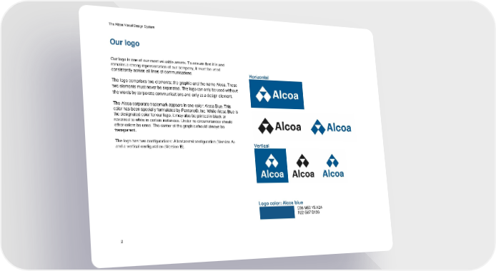 The Alcoa Visual Design System Our logo Our logo is one of our most valuable assets. To ensure that it is and remains a strong representation of our company, it must be used consistently across all lines of communications. Horizontal The logo comprises two elements; the graphic and the name Alcoa. These two elements must never be separated. The logo can only be used without the words by corporate communications and only as a design element. The Alcoa corporate trademark appears in one color: Alcoa Blue. This color has been specially formulated by PantoneĀ®, Inc. While Alcoa Blue is the designated color for our logo, it may also be printed in black or reversed to white in certain instances. Under no circumstances should other colors be used. The center of the graphic should always be transparent. The logo has two configurations: A horizontal configuration (Version A) Vertical and a vertical configuration (Version B). Logo color: Alcoa blue C96 M53 Y5 K24 R22 G87 B136 2