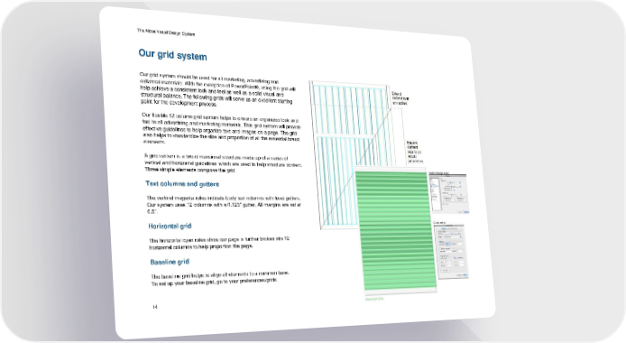 The Alcoa Visual Design System Our grid system Our grid system should be used for all marketing, advertising and collateral materials. With the exception of PowerPoint®, using the grid will help achieve a consistent look and feel as well as a solid visual and structural balance. The following grids will serve as an excellent starting point for the development process. Our flexible 12-column grid system helps to ensure an organized look and feel to all advertising and marketing materials. This grid system will provide effective guidelines to help organize text and images on a page. The grid also helps to standardize the size and proportion of all the essential brand elements. A grid system is a two-dimensional structure made up of a series of vertical and horizontal guidelines which are used to help structure content. Three simple elements compose the grid: Text columns and gutters The vertical magenta rules indicate body text columns with fixed gutters. Our system uses 12 columns with a 0.125" gutter. All margins are set at 0.5". Horizontal grid The horizontal cyan rules show our page is further broken into 12 horizontal columns to help proportion the page. Baseline grid The baseline grid helps to align all elements to a common base. To set up your baseline grid, go to your preferences/grids. 14