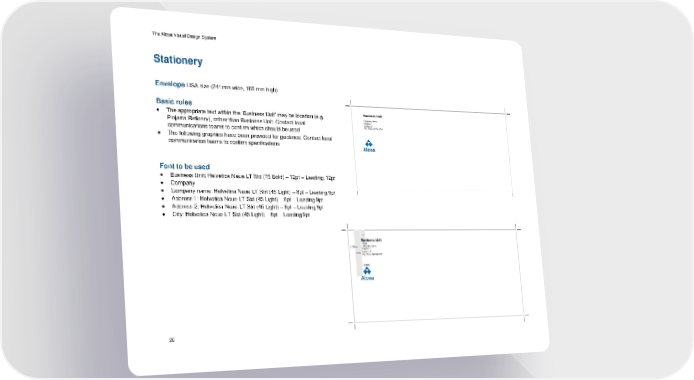 The Alcoa Visual Design System Stationery Envelope USA size (241mm wide, 105 mm high) Basic rules • The appropriate text within the ‘Business Unit’ may be location (e.g. Pinjarra Refinery), rather than Business Unit. Contact local communications teams to confirm which should be used • The following graphics have been provided for guidance. Contact local communication teams to confirm specifications Font to be used • Business Unit: Helvetica Neue LT Std (75 Bold) – 12pt – Leading: 12pt • Company • Company name: Helvetica Neue LT Std (45 Light) – 8pt – Leading 9pt • Address 1: Helvetica Neue LT Std (45 Light) – 8pt – Leading 9pt • Address 2: Helvetica Neue LT Std (45 Light) – 8pt – Leading 9pt • City: Helvetica Neue LT Std (45 Light) – 8pt – Leading 9pt 20