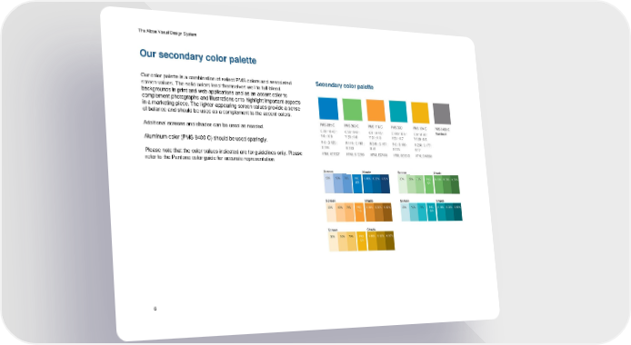 The Alcoa Visual Design System Our secondary color palette Our color palette is a combination of select PMS colors and associated Secondary color palette screen values. The solid colors lend themselves well to full-bleed backgrounds in print and web applications and as an accent color to complement photographs and illustrations or to highlight important aspects in a marketing piece. The lighter-appearing screen values provide a sense of balance and should be used as a complement to the accent colors. Additional screens and shades can be used as needed. Aluminum color (PMS 8400 C) should be used sparingly. Please note that the color values indicated are for guidelines only. Please refer to the Pantone color guide for accurate representation. 8