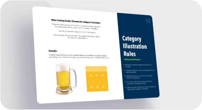 Category Illustration Rules Illustrations should be abstract and simple, not complex Category illustrations must use the appropriate icon and color palette Additional graphics must refer to the category benefits or messaging Use simple shapes, lines, and color blocks as complementary design elements Always use high contrast colors when including our logo or type in category illustrations 18 When Creating Graphic Elements for Category Illustrations: Follow the same process as for brand illustrations; however graphics for category illustrations should refer to category messaging. Use the appropriate category icon and color palette. Keep it simple, do not add detail. The graphic shouldn’t be literal, but open for interpretation. Example: A frothy mug of beer can make a great abstract element for our culinary category by adding a color block at the top to represent the foam and circles for the bubbles.