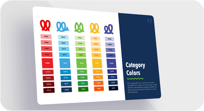 Category Colors Each category features a primary color and an expanded color palette of monochromatic shades and tints. These distinctive category palettes help define and showcase specific aspects of our city and messaging. 17 EF0000 11A9F5 72BF44 F8BC1F 414696 FF2C2C 34C0F7 95EA5E FFC74A 490101 163056 186D06 FC4D00 FF4949 6DD7F7 AAF779 FCD266 6D0000 154E7C 18961E F96806 153056 FF8585 8BD8F7 C7FCA4 FCD98B 9B0202 0777AF 419E05 F79420 1D316A FCA9A9 B8E6F4 DDFCCA F9DFAA C60505 0690C6 53B718 FAA61A 303287 4F559F 040E21 777BB5 AFAED3 C8C8E8