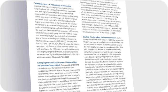 Allianz Research These themes inform our global strategy. We expect Corporate credit – Optimizing the risk-return profile. fixed income, especially investment-grade corporate The extreme “macro-based” 2022 fixed income credit, to outperform equities in 2023, particularly underperformance has pushed corporate yields structurally towards year-end, but not at any cost. In 2024, higher with most of the move triggered by higher long- equities should slightly outperform fixed income, with term rates. In 2023 policy rate expectations will continue emerging markets outpacing both Europe and the US. to dominate corporate credit performance leaving micro Importantly, and due to the current high yields, high fundamentals out of scope and leading to exacerbated quality fixed income may already prove interesting for short-term volatility with a high probability of short- hold-to-maturity investors that can withstand short- lived spread widenings and price underperformance for term volatility (Table 5). In summary: both investment-grade and high-yield credit. However, corporate spreads are bound to compress due to recovering Sovereign rates – A bit too early to overweight fundamentals, relatively high cash positions, improving duration. We expect the prolonged hiking cycle to forward-looking economic sentiment during the second half fully dominate both ends of the sovereign curve next of next year. We expect spreads to remain close to current year leading to flattened yield curves. As market levels for the remainder of the year, with the possibility expectations are coincident with our economists’ policy of some widening waves in H1 2023 (~180bps for IG). path a long-duration overweight call is not warranted Afterwards we expect a structural compression of spreads, as there is still a high risk of markets readjusting for with both IG and HY credit slowly crawling towards long- higher short-term rates. In the Eurozone, this situation term averages (~160bps in 2023 and ~140bps in 2024). could lead to an increase in fragmentation risk which Within this camel-hump-shaped trajectory, we expect high- could keep sovereign spreads persistently higher in yield credit to underperform especially in H1 2023 and to the short run. Because of that, we expect US Treasury structurally compress in 2024 (~450bps by 2024). yields to move timidly lower over the next two years and especially in 2024 due to a decline in the short- Equities – Caution along the investment horizon. Equity end of the curve leading to a timid bull steepening. markets have come under pressure in 2022 due to mounting Numerically, we target a 3.6% 10y US Treasury yield stagflationary concerns weighing on market sentiment. The for 2023 and 3.5% for 2024. Moving across the Atlantic, market leaders of the past 10 years have quickly become we expect 10y Bunds to follow a similar pattern but the main drag to market performance (around -10 to -20% with a delay as the ECB policy turn will most probably ytd). However, and despite the increased recessionary take slightly longer than the US. In this environment, certainty, markets continue to refrain from crossing the we expect the 10y Bund to remain flat at 1.9% in 2023 bear market line and will probably finish the year with while decreasing 20bps to 1.7% in 2024. a low double-digit negative performance, probably underestimating this cycle’s implications on aggregate Emerging markets fixed income - Yields are high, demand. Because of this, it seems too early to call for an but pressures have not left. Rising yields and strong equity market trough and we believe that it is possible corrections over the last two years make EMs to see another sizeable market correction in the short- increasingly attractive later in the year. However, the run should markets readjust for a more aggressive policy risks coming from a weak macroeconomic outlook path or for a deeper recession. This downside pressure remain. Commodities exporters still have an edge in will continue to be exacerbated by the still-high earnings the short-run, but tailwinds from China’s reopening expectations, which will have to readjust in the next 12 and a potential Fed pivot would favor other Southeast months (especially in the US). Moving into late 2023, equity Asian countries. We expect a volatile first half of markets should regain some traction as the push coming the year for hard currency spreads, that could reach from declining short-term rates and the overall economic maximums close to 400, but that should compress recovery should aid risk appetite (~5% to 8% total return towards year end (below 350bps in 2023) and even both in 2023 and 2024). Regionally, we expect Europe and more in 2024 (below 300bps), owing to still high EMs to still post single-digit positive price returns in 2023 commodity prices and improving macro fundamentals. while the US will most likely remain flat. In 2024, we should Similarly, we think there will be interesting entry points see a reacceleration of equity returns, with broad markets through the year in the local currency environment performing just short of double-digit returns and with EM as EM central banks wait for the Fed to move and showing some growing momentum due to low valuations inflation to cool down. The GBI-EM div. will experience in some Asian markets, although with the important caveat sustained yields decreases (6.5% in 2023 and 6% in of important downside risks coming from China and 2024). geopolitics. 26