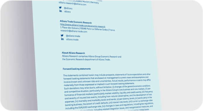 15 December 2022 Director of Publication Ludovic Subran, Chief Economist Allianz SE Phone +49 89 3800 7859 Allianz Group Economic Research https://www.allianz.com/en/economic_research Königinstraße 28 | 80802 Munich | Germany [email protected] @allianz allianz Allianz Trade Economic Research http://www.allianz-trade.com/economic-research 1 Place des Saisons | 92048 Paris-La-Défense Cedex | France [email protected] @allianz-trade allianz-trade About Allianz Research Allianz Research comprises Allianz Group Economic Research and the Economic Research department of Allianz Trade. Forward looking statements The statements contained herein may include prospects, statements of future expectations and other forward-looking statements that are based on management’s current views and assumptions and involve known and unknown risks and uncertainties. Actual results, performance or events may differ materially from those expressed or implied in such forward-looking statements. Such deviations may arise due to, without limitation, (i) changes of the general economic conditions and competitive situation, particularly in the Allianz Group’s core business and core markets, (ii) per- formance of financial markets (particularly market volatility, liquidity and credit events), (iii) frequency and severity of insured loss events, including from natural catastrophes, and the development of loss expenses, (iv) mortality and morbidity levels and trends, (v) per-sistency levels, (vi) particularly in the banking business, the extent of credit defaults, (vii) interest rate levels, (viii) curren-cy exchange rates including the EUR/USD exchange rate, (ix) changes in laws and regulations, including tax regulations, (x) the impact of acquisitions, including related integration issues, and reorganization measures, and (xi) general compet-itive factors, in each case on a local, regional, national and/or global basis. Many of these factors No duty to update The company assumes no obligation to update any information or forward-looking statement cont- ained herein, save for any information required to be disclosed by law. may be more likely to occur, or more pronounced, as a result of terrorist activities and their consequences. 31