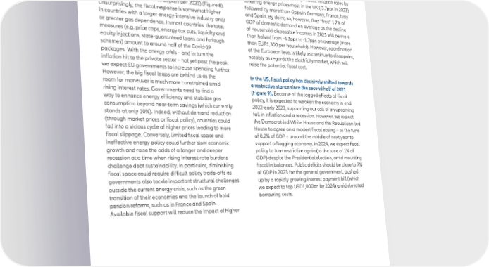 15 December 2022 Fiscal policy: 2023 another exception year; prepare for fiscal consolidation in 2024 Most countries have taken bold steps to cushion the energy prices on real disposable incomes and soften impact of the energy crisis on firms and households. the blow on demand. However, it can also slow down In Europe, most of the current fiscal measures have the reduction in inflation rates overall. We estimate been extended into 2023 for a total of more than 3% that current measures directly reduce inflation rates by of GDP on average in Europe (close to 5% of GDP or lowering energy prices most in the UK (-3.7pps in 2023), more than EUR600bn since September 2021) (Figure 8). followed by more than -2pps in Germany, France, Italy Unsurprisingly, the fiscal response is somewhat higher and Spain. By doing so, however, they “free” 1.7% of in countries with a larger energy-intensive industry and/ GDP of domestic demand on average as the decline or greater gas dependence. In most countries, the total of household disposable incomes in 2023 will be more measures (e.g. price caps, energy tax cuts, liquidity and than halved from -4.3pps to -1.7pps on average (more equity injections, state-guaranteed loans and furlough than EUR1,300 per household). However, coordination schemes) amount to around half of the Covid-19 at the European level is likely to continue to disappoint, packages. With the energy crisis – and in turn the notably as regards the electricity market, which will inflation hit to the private sector – not yet past the peak, raise the potential fiscal cost. we expect EU governments to increase spending further. However, the big fiscal leaps are behind us as the In the US, fiscal policy has decisively shifted towards room for maneuver is much more constrained amid a restrictive stance since the second half of 2021 rising interest rates. Governments need to find a (Figure 9). Because of the lagged effects of fiscal way to enhance energy efficiency and stabilize gas policy, it is expected to weaken the economy in end consumption beyond near-term savings (which currently 2022-early 2023, supporting our call of an upcoming stands at only 10%). Indeed, without demand reduction fall in inflation and a recession. However, we expect (through market prices or fiscal policy), countries could the Democrat-led White House and the Republican-led fall into a vicious cycle of higher prices leading to more House to agree on a modest fiscal easing – to the tune fiscal slippage. Conversely, limited fiscal space and of 0.2% of GDP – around the middle of next year to ineffective energy policy could further slow economic support a flagging economy. In 2024, we expect fiscal growth and raise the odds of a longer and deeper policy to turn restrictive again (to the tune of 1% of recession at a time when rising interest-rate burdens GDP) despite the Presidential election, amid mounting challenge debt sustainability. In particular, diminishing fiscal imbalances. Public deficits should be close to 7% fiscal space could require difficult policy trade-offs as of GDP in 2023 for the general government, pushed governments also tackle important structural challenges up by a rapidly growing interest payment bill (which outside the current energy crisis, such as the green we expect to top USD1,000bn by 2024) amid elevated transition of their economies and the launch of bold borrowing costs. pension reforms, such as in France and Spain. Available fiscal support will reduce the impact of higher 15