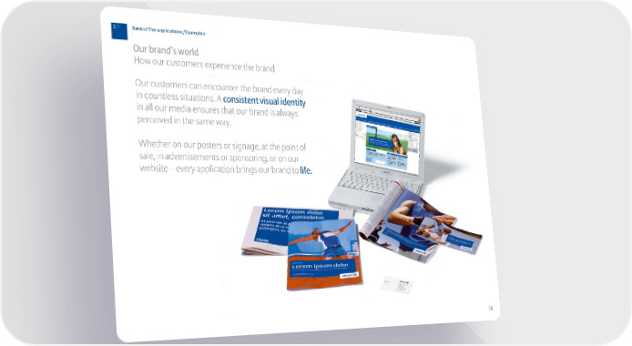 3.1 Basics/The applications/Examples Our brand’s world How our customers experience the brand Our customers can encounter the brand every day in countless situations. A consistent visual identity in all our media ensures that our brand is always perceived in the same way. Whether on our posters or signage, at the point of sale, in advertisements or sponsoring, or on our website – every application brings our brand to life. 38
