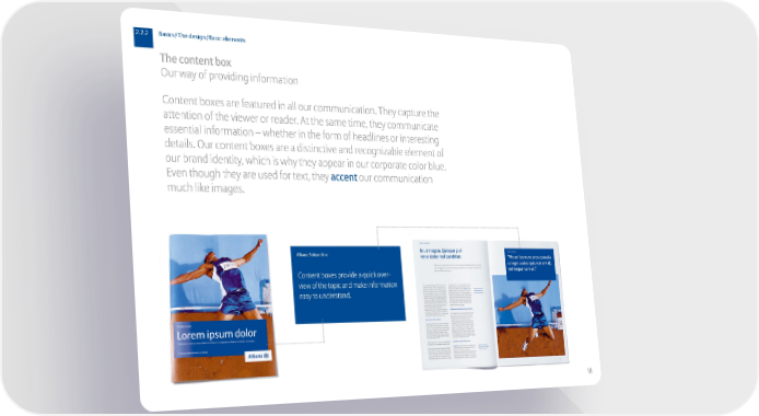 2.2.2 Basics/The design/Basic elements The content box Our way of providing information Content boxes are featured in all our communication. They capture the attention of the viewer or reader. At the same time, they communicate essential information – whether in the form of headlines or interesting details. Our content boxes are a distinctive and recognizable element of our brand identity, which is why they appear in our corporate color blue. Even though they are used for text, they accentour communication much like images. Allianz: Subject line Content boxes provide a quick over- view of the topic and make information easy to understand. 18