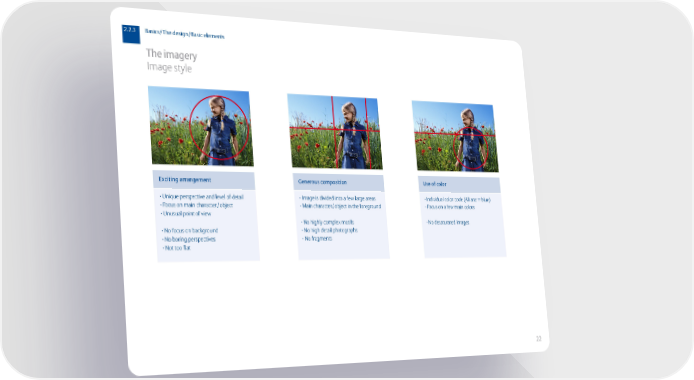 2.2.3 Basics/The design/Basic elements The imagery Image style Exciting arrangement Generous composition Use of color · Unique perspective and level of detail · Image is divided into a few large areas · Individual color code (Allianz = blue) · Focus on main character/object · Main character/object in the foreground · Focus on a few main colors · Unusual point of view · No highly complex motifs · No desaturated images · No focus on background · No high detail photographs · No boring perspectives · No fragments · Not too flat 22