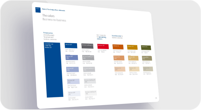 2.2.7 Basics/The design/Basic elements The colors Business-to-business Primary colors Red: Usage only Secondary colors for (including gray) for eye-catching business customers for private and elements business customers Corporate Color Pantone 287 Pantone Cool Gray 10 Pantone 1797 Pantone 154 Pantone 1255 Pantone 5743 Allianz Blue Pantone 287 CMYK100/65/0/15 CMYK0/0/0/72 CMYK10/100/90/0 CMYK25/75/100/0 CMYK30/50/100/0 CMYK80/60/100/0 RGB 17/51/136 RGB 148/148/148 RGB 198/0/0 RGB 177/73/17 RGB 182/130/54 RGB 63/84/41 Pantone 287 Pantone Cool Gray 10 Pantone 154 Pantone 1255 Pantone 5743 60% 60% 60 % 60 % 60 % CMYK60/35/0/10 CMYK0/0/0/56 CMYK20/45/60/0 CMYK18/30/60/0 CMYK50/30/60/0 RGB 66/107/179 RGB 193/193/193 RGB 205/141/107 RGB 204/165/110 RGB 136/159/113 Pantone 287 Pantone Cool Gray 10 Pantone 154 Pantone 1255 Pantone 5743 40% 40% 30 % 30 % 30 % CMYK40/20/0/7 CMYK0/0/0/38 CMYK10/20/25/0 CMYK 9/15/30/0 CMYK25/10/25/0 RGB 129/156/204 RGB 215/215/215 RGB 237/212/191 RGB 235/213/181 RGB 199/216/181 Pantone 287 Pantone Cool Gray 10 20% 20% CMYK20/10/0/5 CMYK0/0/0/25 RGB 149/171/201 RGB 235/235/235 Pantone 287 Pantone Cool Gray 10 8% 10% CMYK8/4/0/0 CMYK0/0/0/12 RGB 229/236/246 RGB 245/245/245 34