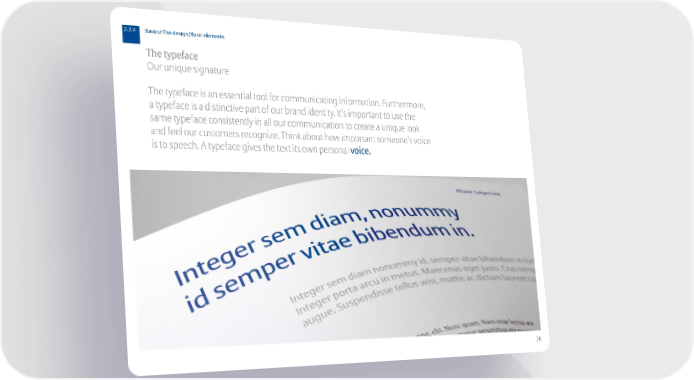 2.2.4 Basics/The design/Basic elements The typeface Our unique signature The typeface is an essential tool for communicating information. Furthermore, a typeface is a distinctive part of our brand identity. It’s important to use the same typeface consistently in all our communication to create a unique look and feel our customers recognize. Think about how important someone’s voice is to speech. A typeface gives the text its own personal voice. 26