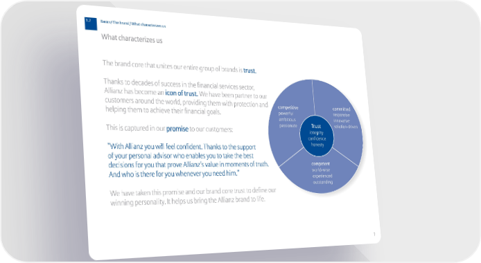 1.2 Basics/The brand/What characterizes us What characterizes us The brand core that unites our entire group of brands is trust. Thanks to decades of success in the financial services sector, Allianz has become an icon of trust.We have been partner to our customers around the world, providing them with protection and committed competitive helping them to achieve their financial goals. powerful responsive ambitious innovative This is captured in our promiseto our customers: passionate Trust solution-driven integrity confidence “With Allianz you will feel confident. Thanks to the support honesty of your personal advisor who enables you to take the best decisions for you that prove Allianz’s value in moments of truth. competent And who is there for you whenever you need him.” world-wise experienced outstanding We have taken this promise and our brand core trust to define our winning personality. It helps us bring the Allianz brand to life. 7