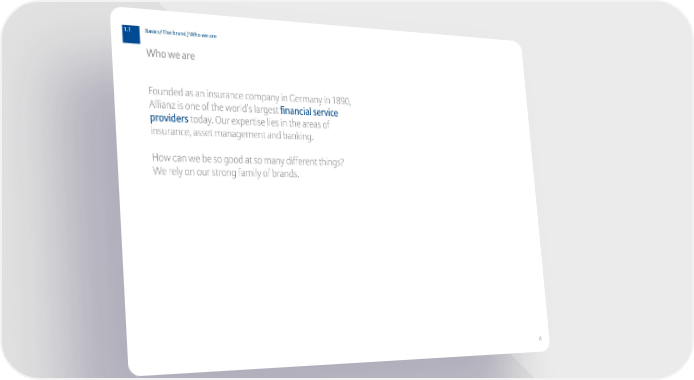 1.1 Basics/The brand/Who we are Who we are Founded as an insurance company in Germany in 1890, Allianz is one of the world’s largest financial service providerstoday. Our expertise lies in the areas of insurance, asset management and banking. How can we be so good at so many different things? We rely on our strong family of brands. 4