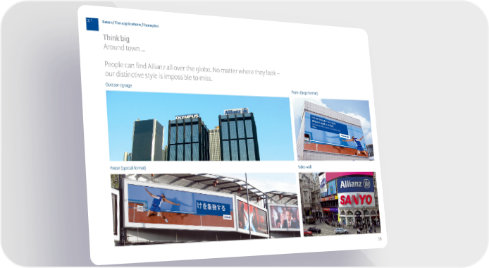 3.1 Basics/The applications/Examples Think big Around town ... People can find Allianz all over the globe. No matter where they look – our distinctive style is impossible to miss. Outdoor signage Poster (large format) Poster (special format) Video wall 39