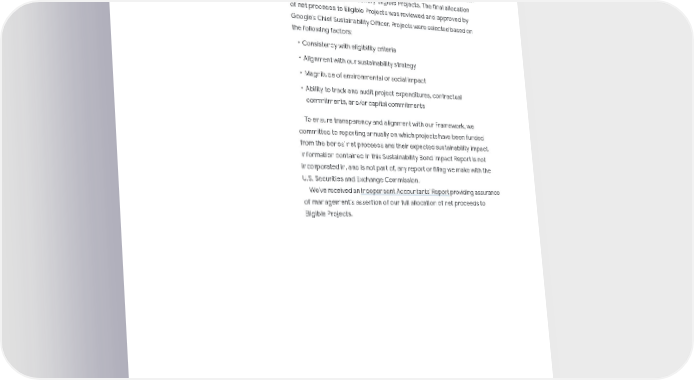 Project selection and reporting A committee consisting of representatives from Alphabet’s Sustainability, Treasury, and Finance teams evaluated a broad array of projects from across the company to identify Eligible Projects. The final allocation of net proceeds to Eligible Projects was reviewed and approved by Google’s Chief Sustainability Officer. Projects were selected based on the following factors: ˦ Consistency with eligibility criteria ˦ Alignment with our sustainability strategy ˦ Magnitude of environmental or social impact ˦ Ability to track and audit project expenditures, contractual commitments, and/or capital commitments To ensure transparency and alignment with our Framework, we committed to reporting annually on which projects have been funded from the bonds’ net proceeds and their expected sustainability impact. Information contained in this Sustainability Bond Impact Report is not incorporated in, and is not part of, any report or filing we make with the U.S. Securities and Exchange Commission. We’ve received an Independent Accountants’ Report providing assurance of management’s assertion of our full allocation of net proceeds to Eligible Projects. 10 Alphabet Sustainability Bond Impact Report 2022 About our Sustainability Bond