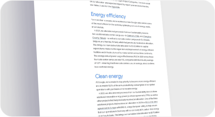 Overview In this section, we report on the allocation of net proceeds in fiscal year 2021, as well as the cumulative total allocation for our Sustainability Bond in the Reporting Period, for each of our eight Project Categories. For more detail on our allocation and expected impact by report year and bond tranche, see Tables 3 and 4 in the Appendix . Energy efficiency For more than a decade, we’ve worked to make Google data centers some of the most efficient in the world by optimizing our use of energy, water, and materials. In 2021, we allocated net proceeds from our Sustainability Bond to two additional data center campuses—in Quilicura, Chile , and Changhua Co u nt y, Taiwa n —as well as to our data center campuses in St. Ghislain, Belgium, and Hamina, Finland, which had previously received an allocation. This brings our cumulative total allocation to $1.02 billion in capital expenditures related to the expansion and improvement of energy-efficient facilities and infrastructure at four data centers across three continents. The average annual power usage effectiveness (PUE) in 2021 across these four data center campuses was 1.10, compared with the industry average of 1.57 3 —meaning that these data centers use, on average, about six times less overhead energy. Clean energy At Google, we’ve made it a top priority to become more energy efficient and to match 100% of the annual electricity consumption of our global operations with purchases of renewable energy. In 2021, we allocated net proceeds from our Sustainability Bond to three additional renewable energy power purchase agreements (PPAs) as well as other projects that had previously received an allocation. One of the three additional projects that received an allocation in 2021 is a first-of-its-kind agreement in Europe with ENGIE, a large European utility, to help ensure that our operations in Germany will run on nearly 80% carbon-free energy on an hourly basis. This brings our cumulative total allocation to $1.75 billion in expenditures and contractual commitments to purchase electricity from renewable energy sources. This includes a total of 45 PPAs across three continents with a combined capacity of approximately 5.3 gigawatts. These are all long-term projects new to the grid that meet our criteria of additionality . We estimate that these renewable energy PPAs combined will avoid nearly 25 million metric tons of carbon dioxide equivalent (tCO 2 e) emissions. 12 Alphabet Sustainability Bond Impact Report 2022 Featured projects and impact