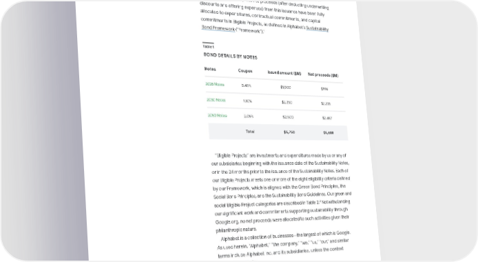 Our Sustainability Bond In August 2020, Alphabet issued $5.75 billion in sustainability bonds (“2020 Sustainability Bond” or “Sustainability Bond”), composed of three tranches (Table 1). The net proceeds (after deducting underwriting discounts and offering expenses) from this issuance have been fully allocated to expenditures, contractual commitments, and capital commitments in Eligible Projects, as defined in Alphabet’s Sustainability Bond Framework (“Framework”). 1 Notes Coupon Issued amount ($M) Net proceeds ($M) 2025 Notes 0.45% $1,000 $996 2030 Notes 1.10% $2,250 $2,235 2050 Notes 2.05% $2,500 $2,457 Tota l $5,750 $5,688 Table 1 BOND DETAILS BY NOTES “Eligible Projects” are investments and expenditures made by us or any of our subsidiaries beginning with the issuance date of the Sustainability Notes, or in the 24 months prior to the issuance of the Sustainability Notes. Each of our Eligible Projects meets one or more of the eight eligibility criteria defined by our Framework, which is aligned with the Green Bond Principles, the Social Bond Principles, and the Sustainability Bond Guidelines. Our green and social Eligible Project categories are described in Table 2. 2 Notwithstanding our significant work and commitments supporting sustainability through Google.org, no net proceeds were allocated to such activities given their philanthropic nature. Alphabet is a collection of businesses—the largest of which is Google. As used herein, “Alphabet,” “the company,” “we,” “us,” “our,” and similar terms include Alphabet Inc. and its subsidiaries, unless the context indicates otherwise. For a detailed overview of our allocation and expected impact by bond, see Table 3 and Table 4 in the Appendix . 8 Alphabet Sustainability Bond Impact Report 2022 About our Sustainability Bond