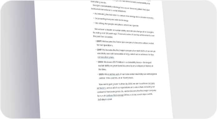 Our sustainability approach We believe that every business has the opportunity and obligation to protect our planet and support the communities where it operates. Sustainability is one of our core values at Google, and we strive to build sustainability into everything we do. Google’s sustainability strategy focuses on three key pillars that span both environmental and social initiatives: ˦ Accelerating the transition to carbon-free energy and a circular economy ˦ Empowering everyone with technology ˦ Benefiting the people and places where we operate We’ve been a leader on sustainability and climate change since Google’s founding over 20 years ago. These are some of our key achievements over the past two decades: ˦ 2007: We became the first major company to become carbon neutral for our operations. ˦ 2017: We became the first major company to match 100% of our annual electricity use with renewable energy, which we’ve achieved for five consecutive years . ˦ 2020: We issued $5.75 billion in sustainability bonds—the largest sustainability or green bond issuance by any company in history at the time. ˦ 2021: We matched 66% of our data center electricity use with regional carbon-free sources, on an hourly basis. Now we’re going even further. By 2030 we aim to achieve net-zero emissions across all of our operations and value chain, including our consumer hardware products, and to become the first major company to run on carbon-free energy 24 hours a day, seven days a week, 365 days a year. 5 Alphabet Sustainability Bond Impact Report 2022 Introduction