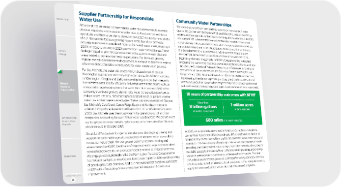 21 ISSUED: NOV. 2021 Supplier Partnership for Responsible Water Use Altria conducts an annual comprehensive water risk assessment to examine physical, regulatory and reputational water risks to Altria’s companies’ direct operations and their value chains. Based on our 2020 risk assessment, several of our international tobacco growing regions and a few of our domestic growing regions were considered high risk for overall water stress, resulting in 26.9% of tobacco volume in 2020 sourced from water-stressed areas. These findings helped to prioritize conversations with suppliers in water-stressed areas related to our environmental expectations. For domestic growing regions, the risk assessment findings served as an input to determine regions where we direct charitable contributions for water conservation projects. For Ste. Michelle, the water risk assessment indicated most of eastern Washington is at high or extremely high water stress. Ste. Michelle wineries in Washington, Oregon and California use drip irrigation on their vineyards. It minimizes water loss by efficiently delivering water to the plant’s roots, as compared to overhead systems that water the entire vineyard. 95% of the company’s contract growers also employ water conservation practices to reduce water intensity. Weather stations and soil moisture probes monitor water use and eliminate wasted water. These practices have helped Chateau Ste. Michelle’s Cold Creek, Canoe Ridge Estate and Northstar vineyards achieve third-party sustainable certification for LIVE and Salmon Safe since 2009. Ste. Michelle uses the most water in its operations out of all of our companies, accounting for over 78% of water used in 2020. We plan to re-set our long-term environmental targets to account for the sale of Ste. Michelle, which we sold in October 2021. Altria's Leaf Procurement organization also provides ongoing training and support on sustainable agriculture practices to improve water stewardship across our value chain. We use grower communications, training and assessments like GAPC Certification Program to encourage domestic direct contracted growers to use production best practices to mitigate water risk. We engage with stakeholders like the Farm Labor Practices Group and the North Carolina Agribusiness Council to improve implementation and reporting of good agricultural practices. And our international leaf suppliers participate in STP with a focus on positive environmental impact and continuous improvement. Community Water Partnerships We know that runoff from farmland into streams or rivers can hurt water quality. We partner with the National Fish and Wildlife Foundation (NFWF) to understand how agriculture, like tobacco farming, affects watersheds. In 2020, Altria and NFWF celebrated 10 years of partnership in water conservation, sustainable agriculture and habitat restoration in regions aligned with Altria’s agricultural value chain in the United States. At the core of the partnership is a shared priority to ensure clean, abundant water for people and the environment in the communities Altria and their employees call home. Beginning with early investments in NFWF’s Chesapeake Bay watershed programs, the partnership has since grown beyond the mid-Atlantic and now includes the Cumberland Plateau in Kentucky and Tennessee, longleaf pine ecosystems of the southeast, and the Columbia Basin in Washington and Oregon. Since 2010, Altria has donated over $14 million to educate farmers, implement soil health management practices, plant riparian buffers around waterways, and other conservation projects that protect natural habitats and reduce the environmental impact of agricultural practices on local watersheds. In 2020, we supported a new environmental justice initiative through the James River Association (JRA). According to JRA, more than one-third of all Virginians rely on the James River and its tributaries for water, commerce and recreation. JRA has a history of reaching underserved communities through providing environmental education programs in Title I schools, advocating for equitable access to the James River in Richmond city planning, and creating walkable greenspaces in traditionally underserved communities. This year JRA added environmental justice as a principal for setting advocacy priorities and they’ve launched an internal cultural initiative to further integrate diversity, equity, inclusion and justice values into their mission and programs. 680 miles of stream restored More than 8 billion gallons of water conserved 1 million acres of land restored 10 years of partnership outcomes with NFWF