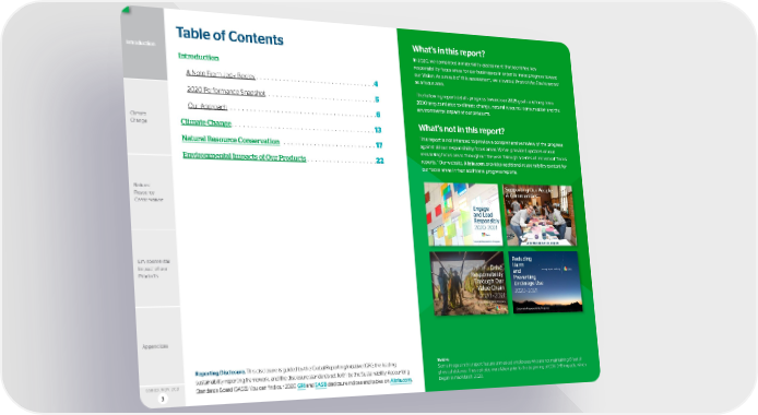 3 ISSUED: NOV. 2021 Reporting Disclosure. This disclosure is guided by the Global Reporting Initiative (GRI), the leading sustainability reporting framework, and the disclosure standards set forth by the Sustainability Accounting Standards Board (SASB). You can find our 2020 GRI and SASB disclosure indices and tables on Altria.com . What’s in this report? In 2020, we completed a materiality assessment that identified key responsibility focus areas for our businesses in order to make progress toward our Vision. As a result of this assessment, we elevated Protect the Environment as a focus area. The following report details progress toward our 2025 goals and long-term 2030 targets related to climate change, natural resource conservation and the environmental impact of our products. What’s not in this report? This report is not intended to provide a comprehensive review of the progress against all our responsibility focus areas. We’ve provided updates on our remaining focus areas throughout the year through a series of individual “focus reports.” Our website, Altria.com , provides additional responsibility content for our focus areas in four additional progress reports. Table of Contents Introduction A Note From Jody Begley . . . . . . . . . . . . . . . . . . . . . . . . . . . . . . . . 4 2020 Performance Snapshot . . . . . . . . . . . . . . . . . . . . . . . . . . . . . 5 Our Approach . . . . . . . . . . . . . . . . . . . . . . . . . . . . . . . . . . . . . . . 6 Climate Change . . . . . . . . . . . . . . . . . . . . . . . . . . . . . . . . . . . . . . 13 Natural Resource Conservation . . . . . . . . . . . . . . . . . . . . . . . . . 17 Environmental Impacts of Our Products . . . . . . . . . . . . . . . . . . . 22 Supporting Our People & Communities 2020 –2021 Corporate Responsibility Progress Notes: Some images in this report feature unmasked employees who are not maintaining 6 feet of physical distance. These photos were taken prior to the beginning of COVID-19 impacts, which began in mid-March, 2020.