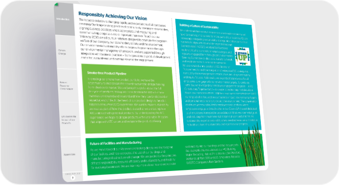 7 ISSUED: NOV. 2021 Responsibly Achieving Our Vision The tobacco industry is changing rapidly, and expectations of all companies are rising. Our long-standing practice of continuously listening to stakeholders, aligning business practices where appropriate, and measuring and communicating progress is more important than ever. To achieve our Vision by 2030, we will pursue initiatives designed to promote the long-term welfare of our company, our stakeholders, society and the environment. Our environmental sustainability efforts begin with governance through our environmental management framework, and are supported through integration with business practices – from operations to product development and a focus on internal and external stakeholder engagement. Future of Facilities and Manufacturing As we move toward our Vision we are looking deeply into the footprint of our facilities and how we expect the use of our buildings and manufacturing infrastructure will change. We are guided by the principles of fiscal responsibility, resource efficiency and sustainability, and flexibility for evolving businesses. We are learning more about how to incorporate sustainability into our buildings and facilities; projects that exemplify this evolution are our HQ Building , Water Recycling Hub at Philip Morris USA (PM USA) , Wetlands at Park 500 and U.S. Smokeless Tobacco (USSTC) Company’s Rain Gardens . Smoke-free Product Pipeline In creating our smoke-free product portfolio, we have the opportunity to incorporate the newest sustainable design thinking from ideation to market. We are being thoughtful about the full life cycle of products, taking into consideration the impact of how materials are created and sourced and how they can be disposed or reused at end of life. At the heart of our product design is the adult tobacco consumer (ATC) experience. We want to make sustainability an intuitive part of how the product is used so we are testing how ATCs interact with potential products. By understanding the ATC experience, we hope to design products with sustainable life cycles that align with ATC values and enhance the product offering. Building a Culture of Sustainability We understand that society’s transition to a sustainable economy will have far-reaching implications for many parts of our business. We are increasingly integrating sustainability strategy into critical parts of our business to align with stakeholder expectations and business need. In 2020, we identified functional leaders critical to our environmental strategies and regularly engaged them through an Environmental Steering Committee to discuss sustainability trends and implications for functional departments. We also created a new position, ESG Director of Procurement, to lead the integration of enterprise ESG strategy into our supply chain management infrastructure, including sustainability and equity focuses. Additionally, we expanded opportunities for all employees to engage with our environmental targets. To celebrate Earth Day, we leveraged our employee engagement program — Altria Contributing Together (act.) — to create opt-in learning modules about Altria’s environmental efforts. Together, employees completed over 1,900 learning activities focused on our business impact, environmental targets and personal responsibility to protect the environment. The conversation continues year-round in Altria’s employee social platform where employees engage with each other in our Green Up! channel dedicated to all employees interested in stewardship of Altria’s environmental goals and reducing their environmental footprint at work and at home. As sustainability expectations and business need increase, we will continue to build a culture of sustainability and report on our progress.