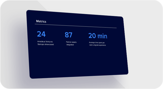 Metrics 24 87 20 min Amadeus Ventures Partner assets Average time spent per Startups showcased integrated visit to digital experience