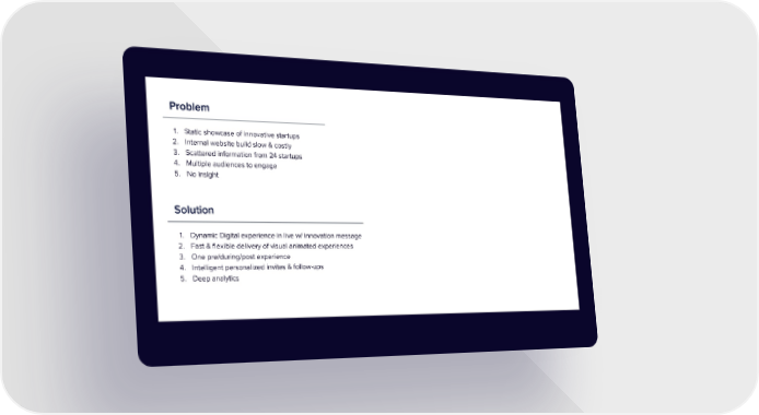 Problem 1. Static showcase of innovative startups 2. Internal website build slow & costly 3. Scattered information from 24 startups 4. Multiple audiences to engage 5. No insight Solution 1. Dynamic Digital experience in live w/ innovation message 2. Fast & flexible delivery of visual animated experiences 3. One pre/during/post experience 4. Intelligent personalized invites & follow-ups 5. Deep analytics
