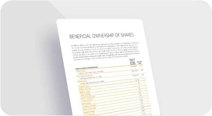 BENEFICIAL OWNERSHIPOFSHARES ThefollowingtablesetsforthcertaininformationregardingthebeneficialownershipofourcommonstockasofFebruary22, 2022(exceptasotherwise indicated) by (i) each person or entity known by us to beneficially own more than 5% of our commonstock,(ii) each director, (iii) each executive officer for whom compensation information is given in the Summary CompensationTableinthisProxyStatement,and(iv)alldirectors and executive officers as a group. Except as otherwise indicated, and subject to any interests of the reporting person’s spouse, we believe that the beneficial owners of common stock listed below, based on information furnished by such owners, have sole voting and investment power with respect to such shares. As of February 22, 2022, we had 508,623,592 shares of common stock outstanding. Amountand Natureof Beneficial Percent of NameandAddressofBeneficialOwner Ownership Class Jeffrey P. Bezos 64,588,418(1) 12.7% 410TerryAvenueNorth,Seattle, WA 98109 TheVanguardGroup,Inc. 33,421,754(2) 6.6% 100VanguardBlvd,Malvern,PA19355 BlackRock, Inc. 28,764,843(3) 5.7% 55East52ndStreet,NewYork,NY10055 AndrewR.Jassy 94,729 * Keith B. Alexander 96 * Edith W. Cooper 24 * JamieS.Gorelick 5,752 * Daniel P. Huttenlocher 1,036 * Judith A. McGrath 2,052 * Indra K. Nooyi 1,034 * JonathanJ.Rubinstein 6,072 * Patricia Q. Stonesifer 2,139 * WendellP.Weeks 1,935 * Brian T. Olsavsky 2,372 * DavidH.Clark 4,130 * AdamN.Selipsky 4,581(4) * DavidA.Zapolsky 3,119 * All directors and executive officers as a group (16 persons) 64,723,611(5) 12.7% * Less than 1%. (1) Includes 14,655,736 shares as to which Mr. Bezos has sole voting power and no investment power. (2) As of December 31, 2021, based on information provided in a Schedule 13G filed February 9, 2022. The Vanguard Group has sole voting power with respect to none of the reported shares, shared voting power with respect to 746,087 of the reported shares, sole investment power with respect to 31,601,766 of the reported shares, and shared investment power with respect to 1,819,988 of the reported shares. (3) As of December 31, 2021, based on information provided in a Schedule 13G filed March 11, 2022. BlackRock, Inc. has sole voting powerwithrespect to 24,586,711 of the reported shares, shared voting power with respect to none of the reported shares, and sole investment power with respect to all of the reported shares. (4) Includes 17 shares as to which Mr. Selipsky shares or may be deemed to share investment power. Mr. Selipsky disclaims beneficial ownership of such shares. (5) Includes 6,122 shares beneficially owned by other executive officers not individually listed in the table. 2022ProxyStatement 87
