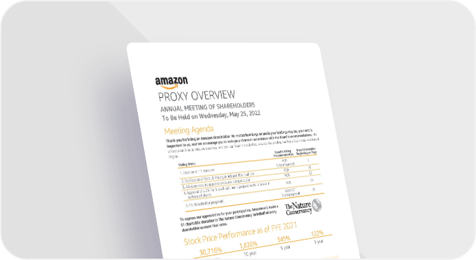 PROXYOVERVIEW ANNUALMEETINGOFSHAREHOLDERS ToBeHeldonWednesday,May25,2022 Meeting Agenda ThankyouforbeinganAmazonshareholder.Nomatterhowlargeorsmallyourholdingsmaybe,yourvoteis importanttous,andweencourageyoutovoteyoursharesinaccordancewiththeBoard’srecommendations.The information here is only an overview, and you can learn more before you vote by reading our Proxy Statement and Annual Report. Board’s Voting MoreInformation VotingItems Recommendation BeginningonPage 1. Election of 11 directors FOR 2 (each nominee) 2. Ratification of Ernst & Young as independent auditors FOR 19 3. Advisory vote to approve executive compensation FOR 22 4. Approval of a 20-for-1 stock split and a proportionate increase in FOR 24 authorized shares 5-19. Shareholder proposals AGAINST 26 (each proposal) Toexpressourappreciationforyourparticipation,Amazonwillmakea $1charitable donation to The Nature Conservancy on behalf of every shareholder account that votes. Stock Price Performance as of FYE 2021 30,716% 1,826% 345% 122% 20year 10year 5year 3year Executive Compensation • Ourexecutivecompensationphilosophyfocusesonthetruelong-termsuccessofourbusiness,noton isolated one-, two-, or three-year goals that encompass only a limited and selective portion of our objectives andthatcanrewardexecutives with above-target payouts even when the stock price remains flat or declines. • Ouremphasisonperiodicgrantsoftime-vested restricted stock units that vest over the long term perfectly aligns our executives’ compensation with the returns we deliver to shareholders. • Having considered other approaches to structuring executive compensation arrangements, we remain committedtothestructureofourexecutivecompensationbecauseithasworkedeffectively,having allowed us to: ✓attract and retain incredibly talented people who have guided our business through countless challenges; ✓developourbusinessinwaysthatwecouldnothaveconceivedafewyearsearlier,includinginitiatives that later became AWS, Kindle, Alexa, and our robust third-party seller business; ✓makelong-termcommitmentstosustainabilityandotherenvironmental, social, and human capital initiatives andgoals; and ✓deliver strong long-term returns to our shareholders.