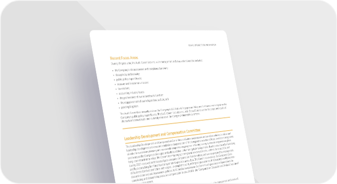 BOARDOFDIRECTORSINFORMATION Recent Focus Areas During the past year, the Audit Committee met with management and reviewed matters that included: • the Company’s risk assessment and compliance functions; • data privacy and security; • public policy expenditures; • treasury and investment matters; • tax matters; • accounting industry issues; • the performance of our internal audit function; • the reappointment of our independent auditor; and • pending litigation. TheAuditCommitteeannuallyreviewstheCompany’sU.S.Political Engagement Policy and Statement and a report on the Company’spublic policy expenditures. The Audit Committee also met with the auditors to review the scope and results of the auditor’s annual audit and quarterly reviews of the Company’s financial statements. Leadership Development and Compensation Committee TheLeadership Development and Compensation Committee evaluates our programs and practices relating to talent and leadership development, reviews and establishes compensation of the Company’s executive officers, oversees management of risks for succession planning and our overall compensation program, including our equity-based compensation plans, andoverseestheCompany’sstrategiesandpoliciesrelatedtohumancapitalmanagement,allwithaviewtowardsmaximizing long-term shareholder value. The Committee may engage compensation consultants but did not do so in 2021, and during 2021 reviewed and discussed peer company compensation benchmarking and surveys prepared by management andbyaconsultingfirmhired by managementtoprovidesurveydata. The Committee oversees the Company’s Code of Business Conduct and Ethics with respect to compliance with, and reports pursuant to, the Company’s workplace non- discrimination and anti-harassment policies. Additional information on the Committee’s processes and procedures for considering and determining executive compensation is contained in the “Compensation Discussion and Analysis” section of this Proxy Statement. Recent Focus Areas During the past year, the Leadership Development and Compensation Committee met with management and reviewed matters that included: • the design, amounts, and effectiveness of the Company’s compensation of senior executives; • managementsuccessionplanning; • the Company’s benefit and compensation programs; • the Company’s human resources programs, including review of workplace discrimination and harassment reports, worker safety and workplace conditions, and diversity, equity, and inclusion matters; and • feedback from the Company’s shareholder engagement. 2022ProxyStatement 15