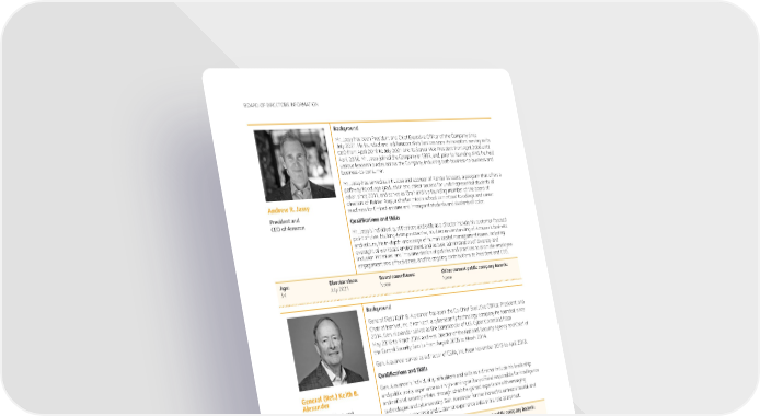 BOARDOFDIRECTORSINFORMATION Background Mr. Jassy has been President and Chief Executive Officer of the Company since July 2021. He founded and led Amazon Web Services since its inception, serving as its CEOfromApril2016toJuly2021anditsSeniorVicePresidentfromApril2006until April 2016. Mr. Jassy joined the Company in 1997, and, prior to founding AWS, he held various leadership roles across the Company, including both business-to-business and business-to-consumer. Mr. Jassy has served as a trustee and sponsor of Rainier Scholars, a program that offers a pathwaytocollege graduation and career success for underrepresented students of color, since 2011, and serves as Chair and is a founding member of the board of AndrewR.Jassy directors of Rainier Prep, a charter middle school committed to college and career readiness for limited-income and immigrant students and students of color. President and Qualifications and Skills CEOofAmazon Mr. Jassy’s individual qualifications and skills as a director include his customer-focused point of view, his long-term perspective, his deep understanding of Amazon’s business andculture, his in-depth knowledge of human capital management issues, including oversight of workplace environment and culture, administration of diversity and inclusion initiatives, and implementation of policies and practices to promote employee engagementandeffectiveness, and his ongoing contributions as President and CEO. Age: Director since: Boardcommittees: Othercurrentpubliccompanyboards: 54 July 2021 None None Background General (Ret.) Keith B. Alexander has been the Co-Chief Executive Officer, President, and Chair of IronNet, Inc. (“IronNet”), a cybersecurity technology company he founded, since 2014. Gen. Alexander served as the Commander of U.S. Cyber Command from May2010toMarch2014andwasDirectoroftheNationalSecurityAgencyandChiefof the Central Security Service from August 2005 to March 2014. Gen. Alexander served as a director of CSRA, Inc. from November 2015 to April 2018. Qualifications and Skills General(Ret.) Keith B. Gen. Alexander’s individual qualifications and skills as a director include his leadership Alexander andpublic policy experience as a high-ranking military official responsible for intelligence Co-CEO,President, and andnational security affairs, through which he gained experience with emerging Chair of IronNet technologies and cybersecurity. Gen. Alexander further honed his entrepreneurial and commercial experience and customer experience skills in his role at IronNet. Age: Director since: Boardcommittees: Othercurrentpubliccompanyboards: 70 September2020 Audit IronNet, Inc. 4