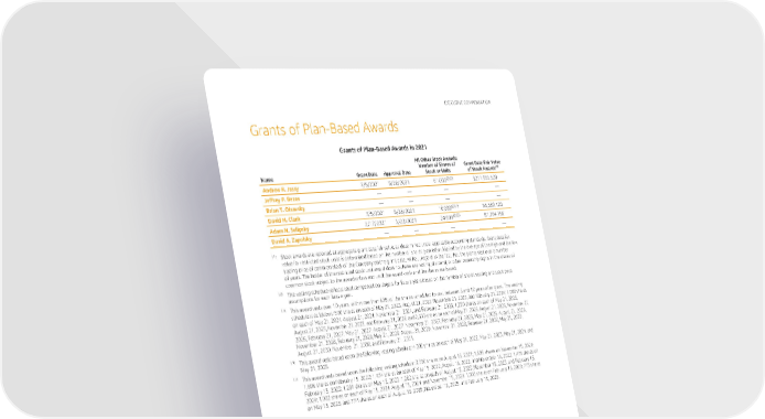 EXECUTIVECOMPENSATION Grants of Plan-Based Awards Grants of Plan-Based Awards in 2021 All Other Stock Awards: NumberofSharesof GrantDateFairValue Name GrantDate ApprovalDate StockorUnits of Stock Awards(1) AndrewR.Jassy 7/5/2021 6/28/2021 61,000(2)(3) $211,933,520 Jeffrey P. Bezos ——— — Brian T. Olsavsky ——— — DavidH.Clark 7/5/2021 6/28/2021 16,000(2)(4) 55,589,120 (2)(5) AdamN.Selipsky 5/17/2021 3/22/2021 24,909 81,294,756 DavidA.Zapolsky ——— — (1) Stock awards are reported at aggregate grant date fair value, as determined under applicable accounting standards. Grant date fair value for restricted stock units is determined based on the number of shares granted multiplied by the average of the high and the low trading price of common stock of the Company on the grant date, without regard to the fact that the grants vest over a number of years. The holder of the restricted stock unit award does not have any voting, dividend, or other ownership rights in the shares of commonstocksubjecttotheawardunlessanduntiltheawardvestsandthesharesareissued. (2) Thevesting schedule reflects total compensation targets for future years based on the number of shares vesting and stock price assumptions for each future year. (3) This award vests over 10 years, with more than 80% of the shares scheduled to vest between 5 and 10 years after grant. The vesting scheduleisasfollows:500sharesoneachofMay21,2023,August21,2023,November21,2023,andFebruary21,2024;1,000shares oneachofMay21,2024,August21,2024,November21,2024,andFebruary21,2025;1,250sharesoneachofMay21,2025, August21,2025,November21,2025,andFebruary21,2026;and2,500sharesoneachofMay21,2026,August21,2026,November21, 2026, February 21, 2027, May 21, 2027, August 21, 2027, November 21, 2027, February 21, 2028, May 21, 2028, August 21, 2028, November21,2028,February21,2029,May21,2029,August21,2029,November21,2029,February21,2030,May21,2030, August 21, 2030, November 21, 2030, and February 21, 2031. (4) This award vests based upon the following vesting schedule: 4,000 shares on each of May 21, 2022, May 21, 2023, May 21, 2024, and May21,2025. (5) This award vests based upon the following vesting schedule: 3,390 shares on August 15, 2021; 1,695 shares on November 15, 2021; 1,696sharesonFebruary15,2022;1,474sharesoneachofMay15,2022,August15,2022,andNovember15,2022;1,475shareson February 15, 2023; 1,281 shares on May 15, 2023; 1,282 shares on each of August 15, 2023, November 15, 2023, and February 15, 2024;1,002sharesoneachofMay15,2024,August15,2024,andNovember15,2024;1,003sharesonFebruary15,2025;773shares onMay15,2025;and774sharesoneachofAugust15,2025,November15,2025,andFebruary15,2026. 2022ProxyStatement 99