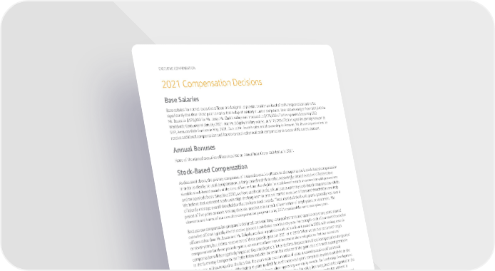 EXECUTIVECOMPENSATION 2021CompensationDecisions BaseSalaries Base salaries for named executive officers are designed to provide a minimum level of cash compensation and to be significantly less than those paid to senior leadership at similarly situated companies. Base salaries ranged from $81,840 for Mr. Bezos to $175,000 for Mr. Jassy. Mr. Clark’s salary was increased to $175,000 effective upon his becoming CEO Worldwide Consumer in January 2021, and Mr. Selipsky’s salary was set at $175,000 effective upon his joining Amazon as SVP, Amazon Web Services in May 2021. Due to Mr. Bezos’s substantial ownership in Amazon, Mr. Bezos requested not to receive additional compensation and has never received annual cash compensation in excess of his current amount. AnnualBonuses Noneofthenamedexecutiveofficersreceived an annual incentive or cash bonus in 2021. Stock-Based Compensation Asdiscussed above, the primary component of a named executive officer’s total compensation is stock-based compensation in order to closely tie total compensation to long-term shareholder value. Accordingly, named executive officers receive sizeable stock-based awards at the time of hire and are also eligible for stock-based awards in connection with promotions andonaperiodicbasis.Sincelate2002,wehaveusedrestrictedstockunitsasourprimarystock-basedcompensationvehicle. Webelievethatrestricted stock units align the long-term interests of named executive officers and shareholders and help efficiently manage overall shareholder dilution from stock awards. These restricted stock unit grants generally vest over a period of five years or more. Vesting does not accelerate as a result of termination of employment or retirement. The elements and terms of our executive compensation program during 2021 remained the same as in prior years. Because our compensation program is designed to reward long-term performance and operate over many years, named executive officers typically do not receive periodic stock-based awards every year. For example, each of our named executive officers other than Mr. Bezos and Mr. Selipsky received a periodic restricted stock unit award in 2020, with vesting over six or seven years, but did not receive one of these periodic grants in 2021 or in 2019. When we set our executives’ target compensation for these periodic grants, we assume a fixed annual increase in the stock price so that our executives’ compensationwillbenegativelyimpactedifourstockpriceisflatordeclines.Becauseannualtotalcompensationasreported in the Summary Compensation Table below includes the entire fair value as of the grant date of a stock award granted in that year, without regard to the fact that the grant vests over a number of years, a named executive officer’s total compensation as reported will be higher in years in which he or she receives a grant compared to years in which he or she does not receive a grant. In contrast, as discussed above, when approving new equity awards, the Leadership Development and Compensation Committee does not focus on the aggregate grant date fair value that is required to be reported in the SummaryCompensationTableunderSECrules,butinsteadevaluatestheannualvalueoftheawardsthatwillvestin future years under various stock price scenarios, taking into account the named executive officer’s cash compensation and the projected annual value of pre-existing stock-based compensation vesting in those subsequent years, if any. DuetoMr.Bezos’ssubstantialstockownership,hebelievesheisappropriatelyincentivizedandhisinterestsareappropriately aligned with shareholders’ interests. Accordingly, Mr. Bezos has never received any stock-based compensation from Amazon. Considerations for 2021 Equity Grants TheLeadership Development and Compensation Committee did not grant any routine, periodic restricted stock unit awards to our executive officers in 2021, but granted special awards in consideration of Messrs. Jassy and Clark’s promotions to President and CEO of Amazon and CEO Worldwide Consumer, respectively, and in connection with recruiting Mr. Selipsky toreturntoAmazontoserveasCEOAWS.Thegrantsmadeinconnectionwiththesepromotionsandnewhirearelargerthan the periodic awards the Company has granted in the past, reflecting a unique transition in our organization’s leadership. Relevant factors and considerations supporting each of these awards are addressed below. 92