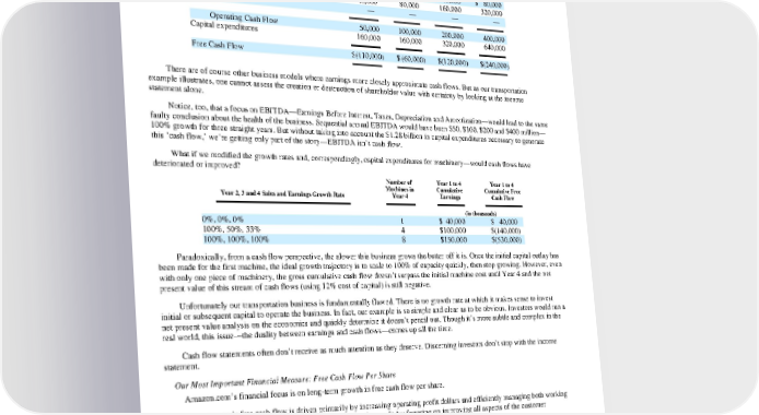 However, looking at cash flows tells a different story. Over the same four years, the transportation business generates cumulative negative free cash flow of $530 million. Cash Flows Year 1 Year 2 Year 3 Year 4 (in thousands) Earnings $ 10,000 $ 20,000 $ 40,000 $ 80,000 Depreciation 40,000 80,000 160,000 320,000 Working capital — — — — Operating Cash Flow 50,000 100,000 200,000 400,000 Capital expenditures 160,000 160,000 320,000 640,000 Free Cash Flow $(110,000) $(60,000) $(120,000) $(240,000) There are of course other business models where earnings more closely approximate cash flows. But as our transportation example illustrates, one cannot assess the creation or destruction of shareholder value with certainty by looking at the income statement alone. Notice, too, that a focus on EBITDA—Earnings Before Interest, Taxes, Depreciation and Amortization—would lead to the same faulty conclusion about the health of the business. Sequential annual EBITDA would have been $50, $100, $200 and $400 million— 100% growth for three straight years. But without taking into account the $1.28 billion in capital expenditures necessary to generate this ‘cash flow,’ we’re getting only part of the story—EBITDA isn’t cash flow. What if we modified the growth rates and, correspondingly, capital expenditures for machinery—would cash flows have deteriorated or improved? Number of Year 1 to 4 Year 1 to 4 Machines in Cumulative Cumulative Free Year 2, 3 and 4 Sales and Earnings Growth Rate Year 4 Earnings Cash Flow in thousands) ( 0%, 0%, 0% 1 $ 40,000 $ 40,000 100%, 50%, 33% 4 $100,000 $(140,000) 100%, 100%, 100% 8 $150,000 $(530,000) Paradoxically, from a cash flow perspective, the slower this business grows the better off it is. Once the initial capital outlay has been made for the first machine, the ideal growth trajectory is to scale to 100% of capacity quickly, then stop growing. However, even with only one piece of machinery, the gross cumulative cash flow doesn’t surpass the initial machine cost until Year 4 and the net present value of this stream of cash flows (using 12% cost of capital) is still negative. Unfortunately our transportation business is fundamentally flawed. There is no growth rate at which it makes sense to invest initial or subsequent capital to operate the business. In fact, our example is so simple and clear as to be obvious. Investors would run a net present value analysis on the economics and quickly determine it doesn’t pencil out. Though it’s more subtle and complex in the real world, this issue—the duality between earnings and cash flows—comes up all the time. Cash flow statements often don’t receive as much attention as they deserve. Discerning investors don’t stop with the income statement. Our Most Important Financial Measure: Free Cash Flow Per Share Amazon.com’s financial focus is on long-term growth in free cash flow per share. Amazon.com’s free cash flow is driven primarily by increasing operating profit dollars and efficiently managing both working apital and capital expenditures. We work to increase operating profit by focusing on improving all aspects of the customer c experience to grow sales and by maintaining a lean cost structure.