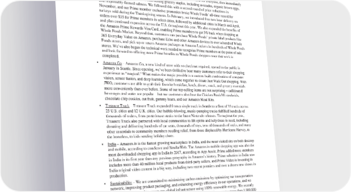 Core10. We’re also continuing to enable thousands of designers and artists to offer their exclusive designs and prints on demand through Merch by Amazon. We finished 2017 with the launch of our interactive shopping experience with Calvin Klein, including pop-up shops, on-site product customization, and fitting rooms with Alexa-controlled lighting, music, and more. • WholeFoods–Whenweclosedouracquisition ofWholeFoodsMarketlast year, weannounced our commitment to making high-quality, natural and organic food available for everyone, then immediately lowered prices on a selection of best-selling grocery staples, including avocados, organic brown eggs, and responsibly-farmed salmon. We followed this with a second round of price reductions in November, and our Prime member exclusive promotion broke Whole Foods’ all-time record for turkeys sold during the Thanksgiving season. In February, we introduced free two-hour delivery on orders over $35 for Prime members in select cities, followed by additional cities in March and April, and plan continued expansion across the U.S. throughout this year. We also expanded the benefits of the Amazon Prime Rewards Visa Card, enabling Prime members to get 5% back when shopping at WholeFoodsMarket.Beyondthat, customers can purchase Whole Foods’ private label products like 365 Everyday Value on Amazon, purchase Echo and other Amazon devices in over a hundred Whole Foods stores, and pick-up or return Amazon packages at Amazon Lockers in hundreds of Whole Foods stores. We’ve also begun the technical work needed to recognize Prime members at the point of sale and look forward to offering more Prime benefits to Whole Foods shoppers once that work is completed. • AmazonGo–AmazonGo,anewkindofstorewithnocheckoutrequired,openedtothepublicin January in Seattle. Since opening, we’ve been thrilled to hear many customers refer to their shopping experience as “magical.” What makes the magic possible is a custom-built combination of computer vision, sensor fusion, and deep learning, which come together to create Just Walk Out shopping. With JWO,customers are able to grab their favorite breakfast, lunch, dinner, snack, and grocery essentials moreconveniently than ever before. Some of our top-selling items are not surprising – caffeinated beverages and water are popular – but our customers also love the Chicken Banh Mi sandwich, chocolate chip cookies, cut fruit, gummy bears, and our Amazon Meal Kits. • Treasure Truck – Treasure Truck expanded from a single truck in Seattle to a fleet of 35 trucks across 25 U.S. cities and 12 U.K. cities. Our bubble-blowing, music-pumping trucks fulfilled hundreds of thousands of orders, from porterhouse steaks to the latest Nintendo releases. Throughout the year, Treasure Truck also partnered with local communities to lift spirits and help those in need, including donating and delivering hundreds of car seats, thousands of toys, tens of thousands of socks, and many other essentials to community members needing relief, from those displaced by Hurricane Harvey, to the homeless, to kids needing holiday cheer. • India – Amazon.in is the fastest growing marketplace in India, and the most visited site on both desktop and mobile, according to comScore and SimilarWeb. The Amazon.in mobile shopping app was also the most downloaded shopping app in India in 2017, according to App Annie. Prime added more members in India in its first year than any previous geography in Amazon’s history. Prime selection in India now includes more than 40 million local products from third-party sellers, and Prime Video is investing in India original video content in a big way, including two recent premiers and over a dozen new shows in production. • Sustainability – We are committed to minimizing carbon emissions by optimizing our transportation network, improving product packaging, and enhancing energy efficiency in our operations, and we have a long-term goal to power our global infrastructure using 100% renewable energy. We recently launched Amazon Wind Farm Texas, our largest wind farm yet, which generates more than 1,000,000 megawatt hours of clean energy annually from over 100 turbines. We have plans to host solar energy systems at 50 fulfillment centers by 2020, and have launched 24 wind and solar projects across the U.S. with more than 29 additional projects to come. Together, Amazon’s renewable energy projects now produce enough clean energy to power over 330,000 homes annually. In 2017 we celebrated the 10-year anniversary of Frustration-Free Packaging, the first of a suite of sustainable packaging initiatives that have eliminated more than 244,000 tons of packaging materials over the past 10 years. In addition, in 2017 alone our programs significantly reduced packaging waste, eliminating the