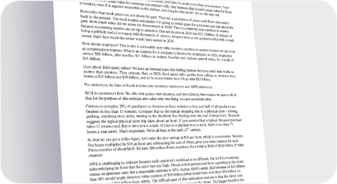 I am approached with similar stories all the time. I know people who’ve used their Amazon money for college, for emergencies, for houses, for vacations, to start their own business, for charity – and the list goes on. I’m proud of the wealth we’ve created for shareowners. It’s significant, and it improves their lives. But I also know something else: it’s not the largest part of the value we’ve created. Create More Than You Consume If you want to be successful in business (in life, actually), you have to create more than you consume. Your goal should be to create value for everyone you interact with. Any business that doesn’t create value for those it touches, even if it appears successful on the surface, isn’t long for this world. It’s on the way out. Rememberthatstockpricesarenotaboutthepast.Theyareapredictionof futurecashflowsdiscounted backtothepresent.Thestockmarketanticipates.I’mgoingtoswitchgearsforamomentandtalkaboutthe past. How much value did we create for shareowners in 2020? This is a relatively easy question to answer because accounting systems are set up to answer it. Our net income in 2020 was $21.3 billion. If, instead of beingapubliclytradedcompanywiththousandsof owners,Amazonwereasoleproprietorshipwithasingle owner, that’s how much the owner would have earned in 2020. Howaboutemployees?Thisisalsoareasonablyeasyvaluecreationquestiontoanswerbecausewecanlook at compensation expense. What is an expense for a company is income for employees. In 2020, employees earned $80 billion, plus another $11 billion to include benefits and various payroll taxes, for a total of $91billion. Howaboutthird-partysellers? We have an internal team (the Selling Partner Services team) that works to answer that question. They estimate that, in 2020, third-party seller profits from selling on Amazon were between $25 billion and $39 billion, and to be conservative here I’ll go with $25 billion. Forcustomers, we have to break it down into consumer customers and AWS customers. We’ll do consumers first. We offer low prices, vast selection, and fast delivery, but imagine we ignore all of that for the purpose of this estimate and value only one thing: we save customers time. Customerscomplete28%of purchasesonAmazoninthreeminutesorless,andhalf of allpurchasesare finished in less than 15 minutes. Compare that to the typical shopping trip to a physical store – driving, parking, searching store aisles, waiting in the checkout line, finding your car, and driving home. Research suggests the typical physical store trip takes about an hour. If you assume that a typical Amazon purchase takes 15 minutes and that it saves you a couple of trips to a physical store a week, that’s more than 75 hours a year saved. That’s important. We’re all busy in the early 21st century. Sothatwecangetadollarfigure,let’s value the time savings at $10 per hour, which is conservative. Seventy- five hours multiplied by $10 an hour and subtracting the cost of Prime gives you value creation for each Primememberof about$630.Wehave200millionPrimemembers,foratotalin2020of $126billionof value creation. AWSischallengingtoestimatebecauseeachcustomer’s workload is so different, but we’ll do it anyway, acknowledging up front that the error bars are high. Direct cost improvements from operating in the cloud versus on premises vary, but a reasonable estimate is 30%. Across AWS’s entire 2020 revenue of $45 billion, that 30% would imply customer value creation of $19 billion (what would have cost them $64 billion on their own cost $45 billion from AWS). The difficult part of this estimation exercise is that the direct cost reduction is the smallest portion of the customer benefit of moving to the cloud. The bigger benefit is the increased speed of software development – something that can significantly improve the customer’s competitiveness and top line. We have no reasonable way of estimating that portion of customer value except to say that it’s almost certainly larger than the direct cost savings. To be conservative here (and rememberingwe’re really only trying to get ballpark estimates), I’ll say it’s the same and call AWS customer value creation $38 billion in 2020. AddingAWSandconsumertogethergivesustotalcustomervaluecreationin2020of $164billion.