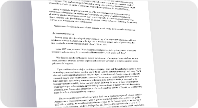 We’vedramatically improved customer self-service capabilities. Customers can now easily find, cancel, or modify their own orders. To find an order, just make sure you are signed in and recognized by the site, and do a regular search on any product in your order. When you get to that product’s detail page, a link to your order will be at the top of the page. Webuilt a new feature called Look Inside the Book. Customers can view large high-resolution images of not only the front cover of a book, but also the back cover, index, table of contents, and a reasonable sample of the inside pages. They can Look Inside the Book before making a buying decision. It’s available on over 200,000 of our millions of titles (as a point of comparison, a typical book superstore carries about 100,000 titles). Asmylastexample, I’ll just point out that one of the most important things we’ve done to improve convenience and experience for customers also happens to be a huge driver of variable cost productivity: eliminating mistakes and errors at their root. Every year that’s gone by since Amazon.com’s founding, we’ve done a better and better job of eliminating errors, and this past year was our best ever. Eliminating the root causes of errors saves us money and saves customers time. Ourconsumerfranchise is our most valuable asset, and we will nourish it with innovation and hard work. Aninvestment framework In every annual letter (including this one), we attach a copy of our original 1997 letter to shareholders to help investors decide if Amazon.com is the right kind of investment for them, and to help us determine if we have remained true to our original goals and values. I think we have. In that 1997 letter, we wrote, “When forced to choose between optimizing the appearance of our GAAP accounting and maximizing the present value of future cash flows, we’ll take the cash flows.” Whyfocusoncashflows?Becauseashareofstockisashareofacompany’sfuture cash flows, and, as a result, cash flows more than any other single variable seem to do the best job of explaining a company’s stock price over the long term. If you could know for certain just two things--a company’s future cash flows and its future number of shares outstanding--you would have an excellent idea of the fair value of a share of that company’s stock today. (You’d also need to know appropriate discount rates, but if you knew the future cash flows for certain, it would also be reasonably easy to know which discount rates to use.) It’s not easy, but you can make an informed forecast of future cash flows by examining a company’s performance in the past and by looking at factors such as the leverage points and scalability in that company’s model. Estimating the number of shares outstanding in the future requires you to forecast items such as option grants to employees or other potential capital transactions. Ultimately, your determination of cash flow per share will be a strong indicator of the price you might be willing to pay for a share of ownership in any company. Since we expect to keep our fixed costs largely fixed, even at significantly higher unit volumes, we believe Amazon.comispoised over the coming years to generate meaningful, sustained, free cash flow. Our goal for 2002 reflects just that. As we said in January when we reported our fourth quarter results, we plan this year to generate positive operating cash flow, leading to free cash flow (the difference between the two is up to $75 million of planned capital expenditures). Our trailing twelve-month pro forma net income should, roughly but not perfectly, trend like trailing twelve-month cash flow. Limiting share count means more cash flow per share and more long-term value for owners. Our current objective is to target net dilution from employee stock options (grants net of cancellations) to an average of 3% per year over the next five years, although in any given year it might be higher or lower.