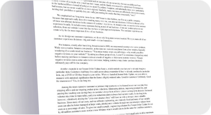 2003 Toourshareholders: Long-term thinking is both a requirement and an outcome of true ownership. Owners are different from tenants. I know of a couple who rented out their house, and the family who moved in nailed their Christmas tree to the hardwood floors instead of using a tree stand. Expedient, I suppose, and admittedly these were particularly bad tenants, but no owner would be so short-sighted. Similarly, many investors are effectively short-term tenants, turning their portfolios so quickly they are really just renting the stocks that they temporarily “own.” Weemphasizedourlong-term views in our 1997 letter to shareholders, our first as a public company, because that approach really does drive making many concrete, non-abstract decisions. I’d like to discuss a few of these non-abstract decisions in the context of customer experience. At Amazon.com, we use the term customer experience broadly. It includes every customer-facing aspect of our business—from our product prices to our selection, from our website’s user interface to how we package and ship items. The customer experience we create is by far the most important driver of our business. Aswedesignourcustomer experience, we do so with long-term owners in mind. We try to make all of our customer experience decisions—big and small—in that framework. For instance, shortly after launching Amazon.com in 1995, we empowered customers to review products. While now a routine Amazon.com practice, at the time we received complaints from a few vendors, basically wondering if we understood our business: “You make money when you sell things—why would you allow negative reviews on your website?” Speaking as a focus group of one, I know I’ve sometimes changed my mind before making purchases on Amazon.com as a result of negative or lukewarm customer reviews. Though negative reviews cost us some sales in the short term, helping customers make better purchase decisions ultimately pays off for the company. Another example is our Instant Order Update feature, which reminds you that you’ve already bought a particular item. Customers lead busy lives and cannot always remember if they’ve already purchased a particular item, say a DVD or CD they bought a year earlier. When we launched Instant Order Update, we were able to measure with statistical significance that the feature slightly reduced sales. Good for customers? Definitely. Good for shareowners? Yes, in the long run. Amongthemostexpensivecustomer experience improvements we’re focused on are our everyday free- shipping offers and our ongoing product price reductions. Eliminating defects, improving productivity, and passing the resulting cost savings back to customers in the form of lower prices is a long-term decision. Increased volumes take time to materialize, and price reductions almost always hurt current results. In the long term, however, relentlessly driving the “price-cost structure loop” will leave us with a stronger, more valuable business. Since many of our costs, such as software engineering, are relatively fixed and many of our variable costs can also be better managed at larger scale, driving more volume through our cost structure reduces those costs as a percentage of sales. To give one small example, engineering a feature like Instant Order Update for use by 40 million customers costs nowhere near 40 times what it would cost to do the same for 1 million customers. Ourpricing strategy does not attempt to maximize margin percentages,butinsteadseekstodrivemaximum value for customers and thereby create a much larger bottom line—in the long term. For example, we’re targeting gross margins on our jewelry sales to be substantially lower than industry norms because we believe over time—customers figure these things out—this approach will produce more value for shareholders.
