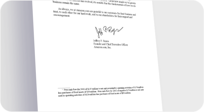 grew at an even faster 34%. Free cash flow—our most important financial measure— reached $135 million, a $305 million improvement over the prior year.¹ In short, what's good for customers is good for shareholders. Once again this year, I attach a copy of our original 1997 letter and encourage current and prospective shareowners to take a look at it. Given how much we’ve grown and how much the Internet has evolved, it's notable that the fundamentals of how we do business remain the same. As always, we at Amazon.com are grateful to our customers for their business and trust, to each other for our hard work, and to our shareholders for their support and encouragement. Jeffrey P. Bezos Founder and Chief Executive Officer Amazon.com, Inc. _________ ¹ Free cash flow for 2002 of $135 million is net cash provided by operating activities of $174 million less purchases of fixed assets of $39 million. Free cash flow for 2001 of negative $170 million is net cash used in operating activities of $120 million less purchases of fixed assets of $50 million.
