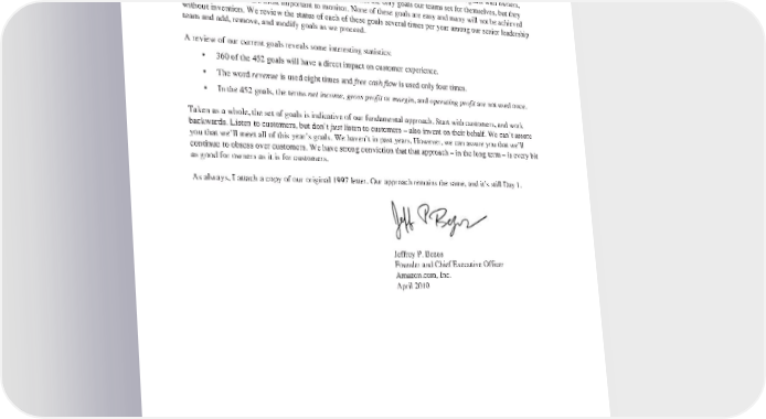financial outputs over time. Our annual goal setting process begins in the fall, and concludes early in the new year after we’ve completed our peak holiday quarter. Our goal setting sessions are lengthy, spirited, and detail- oriented. We have a high bar for the experience our customers deserve and a sense of urgency to improve that experience. We’vebeenusingthis same annual process for many years. For 2010, we have 452 detailed goals with owners, deliverables, and targeted completion dates. These are not the only goals our teams set for themselves, but they are the ones we feel are most important to monitor. None of these goals are easy and many will not be achieved without invention. We review the status of each of these goals several times per year among our senior leadership team and add, remove, and modify goals as we proceed. Areviewofourcurrent goals reveals some interesting statistics: • 360 of the 452 goals will have a direct impact on customer experience. • Thewordrevenueisusedeight times and free cash flow is used only four times. • In the 452 goals, the terms net income, gross profit or margin, and operating profit are not used once. Taken as a whole, the set of goals is indicative of our fundamental approach. Start with customers, and work backwards. Listen to customers, but don’t just listen to customers – also invent on their behalf. We can’t assure you that we’ll meet all of this year’s goals. We haven’t in past years. However, we can assure you that we’ll continue to obsess over customers. We have strong conviction that that approach – in the long term – is every bit as good for owners as it is for customers. Asalways, I attach a copy of our original 1997 letter. Our approach remains the same, and it’s still Day 1. Jeffrey P. Bezos Founder and Chief Executive Officer Amazon.com, Inc. April 2010