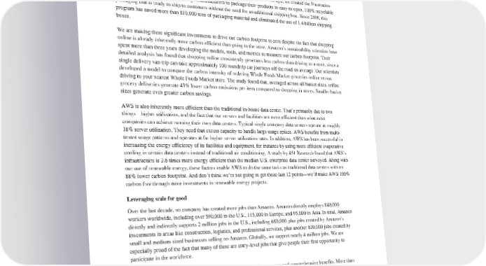 We’vealso committed to reaching 80% renewable energy by 2024 and 100% renewable energy by 2030. (The team is actually pushing to get to 100% by 2025 and has a challenging but credible plan to pull that off.) Globally, Amazon has 86 solar and wind projects that have the capacity to generate over 2,300 MW and deliver morethan 6.3 million MWh of energy annually—enough to power more than 580,000 U.S. homes. We’vemadetremendousprogress cutting packaging waste. More than a decade ago, we created the Frustration- Free Packaging program to encourage manufacturers to package their products in easy-to-open, 100% recyclable packaging that is ready to ship to customers without the need for an additional shipping box. Since 2008, this program has saved more than 810,000 tons of packaging material and eliminated the use of 1.4 billion shipping boxes. Wearemakingthesesignificant investments to drive our carbon footprint to zero despite the fact that shopping online is already inherently more carbon efficient than going to the store. Amazon’s sustainability scientists have spent more than three years developing the models, tools, and metrics to measure our carbon footprint. Their detailed analysis has found that shopping online consistently generates less carbon than driving to a store, since a single delivery van trip can take approximately 100 roundtrip car journeys off the road on average. Our scientists developed a model to compare the carbon intensity of ordering Whole Foods Market groceries online versus driving to your nearest Whole Foods Market store. The study found that, averaged across all basket sizes, online grocery deliveries generate 43% lower carbon emissions per item compared to shopping in stores. Smaller basket sizes generate even greater carbon savings. AWSisalsoinherently more efficient than the traditional in-house data center. That’s primarily due to two things—higher utilization, and the fact that our servers and facilities are more efficient than what most companies can achieve running their own data centers. Typical single-company data centers operate at roughly 18%server utilization. They need that excess capacity to handle large usage spikes. AWS benefits from multi- tenant usage patterns and operates at far higher server utilization rates. In addition, AWS has been successful in increasing the energy efficiency of its facilities and equipment, for instance by using more efficient evaporative cooling in certain data centers instead of traditional air conditioning. A study by 451 Research found that AWS’s infrastructure is 3.6 times more energy efficient than the median U.S. enterprise data center surveyed. Along with our use of renewable energy, these factors enable AWS to do the same tasks as traditional data centers with an 88%lowercarbonfootprint. And don’t think we’re not going to get those last 12 points—we’ll make AWS 100% carbon free through more investments in renewable energy projects. Leveraging scale for good Over the last decade, no company has created more jobs than Amazon. Amazon directly employs 840,000 workers worldwide, including over 590,000 in the U.S., 115,000 in Europe, and 95,000 in Asia. In total, Amazon directly and indirectly supports 2 million jobs in the U.S., including 680,000-plus jobs created by Amazon’s investments in areas like construction, logistics, and professional services, plus another 830,000 jobs created by small and medium-sized businesses selling on Amazon. Globally, we support nearly 4 million jobs. We are especially proud of the fact that many of these are entry-level jobs that give people their first opportunity to participate in the workforce. AndAmazon’sjobscomewithanindustry-leading $15 minimum wage and comprehensive benefits. More than 40 million Americans—many making the federal minimum wage of $7.25 an hour—earn less than the lowest- paid Amazon associate. When we raised our starting minimum wage to $15 an hour in 2018, it had an immediate and meaningful impact on the hundreds of thousands of people working in our fulfillment centers. We want other big employers to join us by raising their own minimum pay rates, and we continue to lobby for a $15 federal minimumwage.