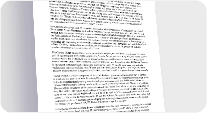 TheClimatePledge In an earlier draft of this letter, I started this section with arguments and examples designed to demonstrate that human-induced climate change is real. But, bluntly, I think we can stop saying that now. You don’t have to say that photosynthesis is real, or make the case that gravity is real, or that water boils at 100 degrees Celsius at sea level. These things are simply true, as is the reality of climate change. Notlongago,mostpeoplebelievedthatitwouldbegoodtoaddressclimatechange,buttheyalsothought it would cost a lot and would threaten jobs, competitiveness, and economic growth. We now know better. Smartaction on climate change will not only stop bad things from happening, it will also make our economymoreefficient, help drive technological change, and reduce risks. Combined, these can lead to moreandbetterjobs,healthierandhappierchildren,moreproductiveworkers,andamoreprosperousfuture. This doesn’t mean it will be easy. It won’t be. The coming decade will be decisive. The economy in 2030 will need to be vastly different from what it is today, and Amazon plans to be at the heart of the change. We launched The Climate Pledge together with Global Optimism in September 2019 because we wanted to help drive this positive revolution. We need to be part of a growing team of corporations that understand st the imperatives and the opportunities of the 21 century. Now,less than two years later, 53 companies representing almost every sector of the economy have signed The Climate Pledge. Signatories such as Best Buy, IBM, Infosys, Mercedes-Benz, Microsoft, Siemens, and Verizon have committed to achieve net-zero carbon in their worldwide businesses by 2040, 10 years ahead of the Paris Agreement. The Pledge also requires them to measure and report greenhouse gas emissions on a regular basis; implement decarbonization strategies through real business changes and innovations; and neutralize any remaining emissions with additional, quantifiable, real, permanent, and socially beneficial offsets. Credible, quality offsets are precious, and we should reserve them to compensate for economic activities where low-carbon alternatives don’t exist. TheClimatePledgesignatories are making meaningful, tangible, and ambitious commitments. Uber has a goal of operating as a zero-emission platform in Canada, Europe, and the U.S. by 2030, and Henkel plans to source 100% of the electricity it uses for production from renewable sources. Amazon is making progress toward our own goal of 100% renewable energy by 2025, five years ahead of our initial 2030 target. Amazon is the largest corporate buyer of renewable energy in the world. We have 62 utility-scale wind and solar projects and 125 solar rooftops on fulfillment and sort centers around the globe. These projects have the capacity to generate over 6.9 gigawatts and deliver more than 20 million megawatt-hours of energy annually. Transportation is a major component of Amazon’s business operations and the toughest part of our plan to meet net-zero carbon by 2040. To help rapidly accelerate the market for electric vehicle technology, and to help all companies transition to greener technologies, we invested more than $1 billion in Rivian – and ordered 100,000 electric delivery vans from the company. We’ve also partnered with Mahindra in India and Mercedes-Benz in Europe. These custom electric delivery vehicles from Rivian are already operational, and they first hit the road in Los Angeles this past February. Ten thousand new vehicles will be on the road as early as next year, and all 100,000 vehicles will be on the road by 2030 – saving millions of metric tons of carbon. A big reason we want companies to join The Climate Pledge is to signal to the marketplace that businesses should start inventing and developing new technologies that signatories need to make good on the Pledge. Our purchase of 100,000 Rivian electric vans is a perfect example. Tofurther accelerate investment in new technologies needed to build a zero-carbon economy, we introduced the Climate Pledge Fund last June. The investment program started with $2 billion to invest in visionary companies that aim to facilitate the transition to a low-carbon economy. Amazon has already announced investments in CarbonCure Technologies, Pachama, Redwood Materials, Rivian, Turntide Technologies, ZeroAvia, and Infinium – and these are just some of the innovative companies we hope will build the zero- carbon economyof the future. I have also personally allocated $10 billion to provide grants to help catalyze the systemic change we will need in the coming decade. We’ll be supporting leading scientists, activists, NGOs, environmental justice organizations,andothersworkingtofightclimatechangeandprotectthenaturalworld.Latelastyear,Imade myfirst round of grants to 16 organizations working on innovative and needle-moving solutions. It’s going