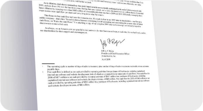 1 We have a cash generative operating cycle because we turn our inventory quickly, collecting payments from our customers before payments are due to suppliers. Our high inventory turnover means we maintain relatively low levels of investment in inventory—$480 million at year end on a sales base of nearly $7 billion. The capital efficiency of our business model is illustrated by our modest investments in fixed assets, which were $246 million at year end or 4% of 2004 sales. 2 Free cash flow grew 38% to $477 million in 2004, a $131 million improvement over the prior year. We are confident that if we continue to improve customer experience—including increasing selection and lowering prices—and execute efficiently, our value proposition, as well as our free cash flow, will further expand. As to dilution, total shares outstanding plus stock-based awards are essentially unchanged at the end of 2004 compared with 2003, and are down 1% over the last three years. During that same period, we’ve also eliminated over six million shares of potential future dilution by repaying more than $600 million of convertible debt that was due in 2009 and 2010. Efficiently managing share count means more cash flow per share and more long-term value for owners. This focus on free cash flow isn’t new for Amazon.com. We made it clear in our 1997 letter to shareholders—our first as a public company—that when “forced to choose between optimizing GAAP accounting and maximizing the present value of future cash flows, we’ll take the cash flows.” I’m attaching a copy of our complete 1997 letter and encourage current and prospective shareowners to take a look at it. As always, we at Amazon.com are grateful to our customers for their business and trust, to each other for our hard work, and to our shareholders for their support and encouragement. Jeffrey P. Bezos Founder and Chief Executive Officer Amazon.com, Inc. April 2005 1 The operating cycle is number of days of sales in inventory plus number of days of sales in accounts receivable minus accounts payable days. 2 Free cash flow is defined as net cash provided by operating activities less purchases of fixed assets, including capitalized internal-use software and website development, both of which are presented on our statements of cash flows. Free cash flow for 2004 of $477 million is net cash provided by operating activities of $567 million less purchases of fixed assets, including capitalized internal-use software and website development costs, of $89 million. Free cash flow for 2003 of $346 million is net cash provided by operating activities of $392 million less purchases of fixed assets, including capitalized internal-use software and website development costs, of $46 million.