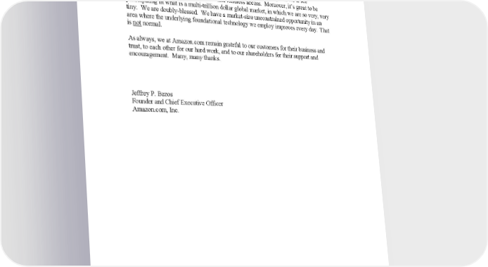 In closing, consider this most important point: the current online shopping experience is the worst it will ever be. It’s good enough today to attract 17 million customers, but it will get so much better. Increased bandwidth will result in faster page views and richer content. Further improvements will lead to “always-on access” (which I expect will be a strong boost to online shopping at home, as opposed to the office) and we’ll see significant growth in non-PC devices and wireless access. Moreover, it’s great to be participating in what is a multi-trillion dollar global market, in which we are so very, very tiny. We are doubly-blessed. We have a market-size unconstrained opportunity in an area where the underlying foundational technology we employ improves every day. That is not normal. As always, we at Amazon.com remain grateful to our customers for their business and trust, to each other for our hard work, and to our shareholders for their support and encouragement. Many, many thanks. Jeffrey P. Bezos Founder and Chief Executive Officer Amazon.com, Inc.