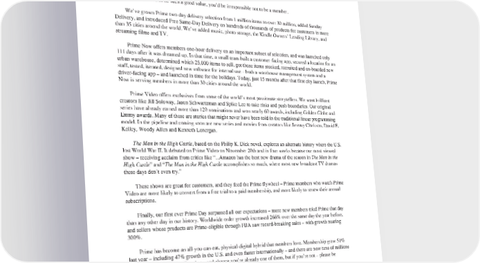 AsImeetwithteamsacross Amazon,Iamcontinually amazed at the passion, intelligence and creativity on display. Our teams accomplished a lot in the last year, and I’d like to share a few of the highlights of our efforts to nourish and globalize our three big offerings – Prime, Marketplace and AWS. And while I’ll focus on those three, I assure you that we also remain hard at work on finding a fourth. Prime WewantPrimetobesuchagoodvalue,you’dbeirresponsible not to be a member. We’vegrownPrimetwo-daydelivery selection from 1 million items to over 30 million, added Sunday Delivery, and introduced Free Same-Day Delivery on hundreds of thousands of products for customers in more than 35 cities around the world. We’ve added music, photo storage, the Kindle Owners’ Lending Library, and streaming films and TV. Prime Nowoffers members one-hour delivery on an important subset of selection, and was launched only 111 days after it was dreamed up. In that time, a small team built a customer-facing app, secured a location for an urban warehouse, determined which 25,000 items to sell, got those items stocked, recruited and on-boarded new staff, tested, iterated, designed new software for internal use – both a warehouse management system and a driver-facing app – and launched in time for the holidays. Today, just 15 months after that first city launch, Prime Nowisserving members in more than 30 cities around the world. Prime Video offers exclusives from some of the world’s most passionate storytellers. We want brilliant creators like Jill Soloway, Jason Schwartzman and Spike Lee to take risks and push boundaries. Our original series have already earned more than 120 nominations and won nearly 60 awards, including Golden Globe and Emmyawards.Manyofthesearestories that might never have been told in the traditional linear programming model. In the pipeline and coming soon are new series and movies from creators like Jeremy Clarkson, David E. Kelley, Woody Allen and Kenneth Lonergan. The ManintheHighCastle, based on the Philip K. Dick novel, explores an alternate history where the U.S. lost World War II. It debuted on Prime Video on November 20th and in four weeks became our most-viewed show–receiving acclaim from critics like “...Amazon has the best new drama of the season in The Man in the High Castle” and “The Man in the High Castle accomplishes so much, where most new broadcast TV dramas these days don’t even try.” These shows are great for customers, and they feed the Prime flywheel – Prime members who watch Prime Video are more likely to convert from a free trial to a paid membership, and more likely to renew their annual subscriptions. Finally, our first ever Prime Day surpassed all our expectations – more new members tried Prime that day than any other day in our history. Worldwide order growth increased 266% over the same day the year before, and sellers whose products are Prime-eligible through FBA saw record-breaking sales – with growth nearing 300%. Prime has become an all-you-can-eat, physical-digital hybrid that members love. Membership grew 51% last year – including 47% growth in the U.S. and even faster internationally – and there are now tens of millions of members worldwide. There’s a good chance you’re already one of them, but if you’re not – please be responsible – join Prime. Marketplace Wetooktwobigswingsandmissed–withAuctionsandzShops–beforewelaunchedMarketplace over15 years ago. We learned from our failures and stayed stubborn on the vision, and today close to 50% of units sold on Amazonaresold by third-party sellers. Marketplace is great for customers because it adds unique selection, and it’s great for sellers – there are over 70,000 entrepreneurs with sales of more than $100,000 a year selling on