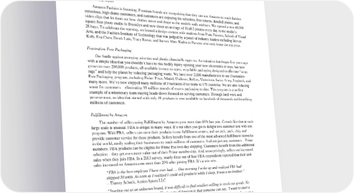 idea of online customer reviews – customers sharing their opinion on a product to help other customers make an informed purchase decision. “Ask” is in that same tradition. From a product page, customers can ask any question related to the product. Is the product compatible with my TV/Stereo/PC? Is it easy to assemble? How long does the battery last? We then route these questions to owners of the product. As is the case with reviews, customers are happy to share their knowledge to directly help other customers. Millions of questions have already been asked and answered. Apparel and Shoes AmazonFashionisbooming.Premiumbrandsarerecognizing that they can use Amazon to reach fashion- conscious, high-demo customers, and customers are enjoying the selection, free returns, detailed photos, and video clips that let them see how clothes move and drape as the models walk and turn. We opened a new 40,000 square foot photo studio in Brooklyn and now shoot an average of 10,413 photos every day in the studio’s 28 bays. To celebrate the opening, we hosted a design contest with students from Pratt, Parsons, School of Visual Arts, and the Fashion Institute of Technology that was judged by a panel of industry leaders including Steven Kolb, Eva Chen, Derek Lam, Tracy Reese, and Steven Alan. Kudos to Parsons who took home the top prize. Frustration-Free Packaging Ourbattle against annoying wire ties and plastic clamshells rages on. An initiative that began five years ago with a simple idea that you shouldn’t have to risk bodily injury opening your new electronics or toys, has now growntoover200,000products, all available in easy-to-open, recyclable packaging designed to alleviate “wrap rage” and help the planet by reducing packaging waste. We have over 2,000 manufacturers in our Frustration- Free Packaging program, including Fisher-Price, Mattel, Unilever, Belkin, Victorinox Swiss Army, Logitech, and manymore.We’venowshippedmanymillionsofFrustration-Free items to 175 countries. We are also reducing waste for customers – eliminating 33 million pounds of excess packaging to date. This program is a perfect example of a missionary team staying heads-down focused on serving customers. Through hard work and perseverance, an idea that started with only 19 products is now available on hundreds of thousands and benefiting millions of customers. Fulfillment by Amazon Thenumberofsellers using Fulfillment by Amazon grew more than 65% last year. Growth like that at such large scale is unusual. FBA is unique in many ways. It’s not often you get to delight two customer sets with one program. With FBA, sellers can store their products in our fulfillment centers, and we pick, pack, ship, and provide customer service for these products. Sellers benefit from one of the most advanced fulfillment networks in the world, easily scaling their businesses to reach millions of customers. And not just any customers – Prime members. FBAproducts can be eligible for Prime free two-day shipping. Customers benefit from this additional selection – they get even more value out of their Prime membership. And, unsurprisingly, sellers see increased sales when they join FBA. In a 2013 survey, nearly three out of four FBA respondents reported that their unit sales increased on Amazon.com more than 20% after joining FBA. It’s a win-win. “FBAisthebestemployee I have ever had. … One morning I woke up and realized FBA had shipped 50 units. As soon as I realized I could sell products while I sleep, it was a no-brainer.” – Thanny Schuck, Action Sports LLC “Starting out as an unknown brand, it was difficult to find retailers willing to stock our goods. No such barriers existed at Amazon. The beauty of Amazon is that someone can say, ‘I want to start a business,’ and they can go on Amazon and really start a business. You don’t have to get a lease on a building or even have any employees at first. You can just do it on your own. And that’s what I did.” – Wendell Morris, YogaRat Login and Pay with Amazon For several years we’ve enabled Amazon customers to pay on other sites, such as Kickstarter, SmugMug, and Gogo Inflight, using the credit cards and shipping addresses already stored in their Amazon account. This
