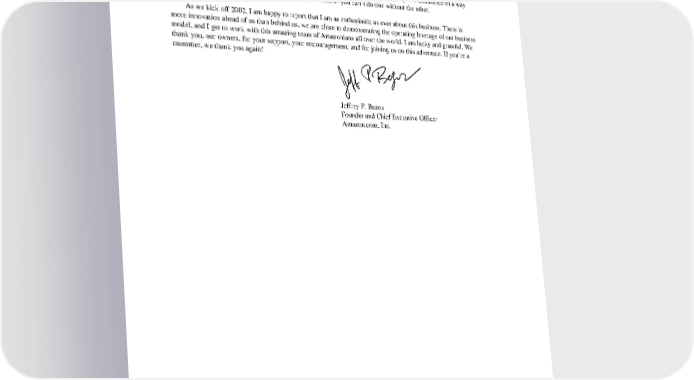 Relentless commitment to long-term shareholder value AsI’ve discussed many times before, we are firm believers that the long-term interests of shareholders are tightly linked to the interests of our customers: if we do our jobs right, today’s customers will buy more tomorrow, we’ll add more customers in the process, and it will all add up to more cash flow and more long-term value for our shareholders. To that end, we are committed to extending our leadership in e-commerce in a way that benefits customers and therefore, inherently, investors--you can’t do one without the other. Aswekickoff2002,IamhappytoreportthatIamasenthusiastic as ever about this business. There is moreinnovation ahead of us than behind us, we are close to demonstrating the operating leverage of our business model, and I get to work with this amazing team of Amazonians all over the world. I am lucky and grateful. We thank you, our owners, for your support, your encouragement, and for joining us on this adventure. If you’re a customer, we thank you again! Jeffrey P. Bezos Founder and Chief Executive Officer Amazon.com, Inc.