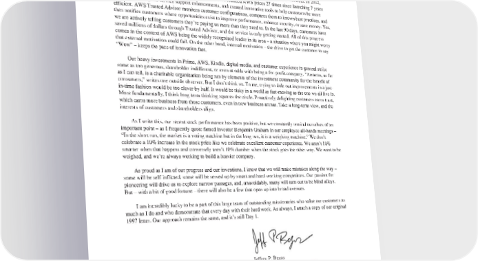 hardware at roughly breakeven prices. We want to make money when people use our devices – not when people buy our devices. We think this aligns us better with customers. For example, we don’t need our customers to be on the upgrade treadmill. We can be very happy to see people still using four-year-old Kindles! I can keep going – Kindle Fire’s FreeTime, our customer service Andon Cord, Amazon MP3’s AutoRip – but will finish up with a very clear example of internally driven motivation: Amazon Web Services. In 2012, AWSannounced159newfeaturesandservices. We’ve reduced AWSprices 27 times since launching 7 years ago, added enterprise service support enhancements, and created innovative tools to help customers be more efficient. AWS Trusted Advisor monitors customer configurations, compares them to known best practices, and then notifies customers where opportunities exist to improve performance, enhance security, or save money. Yes, weareactively telling customers they’re paying us more than they need to. In the last 90 days, customers have saved millions of dollars through Trusted Advisor, and the service is only getting started. All of this progress comesinthecontext of AWS being the widely recognized leader in its area – a situation where you might worry that external motivation could fail. On the other hand, internal motivation – the drive to get the customer to say “Wow”–keepsthepaceofinnovationfast. Ourheavyinvestments in Prime, AWS, Kindle, digital media, and customer experience in general strike someastoogenerous, shareholder indifferent, or even at odds with being a for-profit company. “Amazon, as far as I can tell, is a charitable organization being run by elements of the investment community for the benefit of consumers,” writes one outside observer. But I don’t think so. To me, trying to dole out improvements in a just- in-time fashion would be too clever by half. It would be risky in a world as fast-moving as the one we all live in. Morefundamentally, I think long-term thinking squares the circle. Proactively delighting customers earns trust, which earns more business from those customers, even in new business arenas. Take a long-term view, and the interests of customers and shareholders align. AsIwrite this, our recent stock performance has been positive, but we constantly remind ourselves of an important point – as I frequently quote famed investor Benjamin Graham in our employee all-hands meetings – “In the short run, the market is a voting machine but in the long run, it is a weighing machine.” We don’t celebrate a 10% increase in the stock price like we celebrate excellent customer experience. We aren’t 10% smarter when that happens and conversely aren’t 10% dumber when the stock goes the other way. We want to be weighed, and we’re always working to build a heavier company. AsproudasIamofourprogressandourinventions, I know that we will make mistakes along the way – somewill be self-inflicted, some will be served up by smart and hard-working competitors. Our passion for pioneering will drive us to explore narrow passages, and, unavoidably, many will turn out to be blind alleys. But – with a bit of good fortune – there will also be a few that open up into broad avenues. I am incredibly lucky to be a part of this large team of outstanding missionaries who value our customers as muchasIdoandwhodemonstratethateverydaywiththeir hard work. As always, I attach a copy of our original 1997 letter. Our approach remains the same, and it’s still Day 1. Jeffrey P. Bezos Founder and Chief Executive Officer Amazon.com, Inc. April 2013