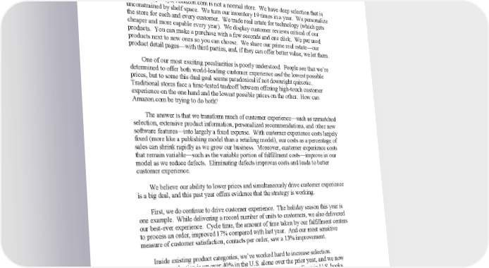 2002 To our shareholders: In many ways, Amazon.com is not a normal store. We have deep selection that is unconstrained by shelf space. We turn our inventory 19 times in a year. We personalize the store for each and every customer. We trade real estate for technology (which gets cheaper and more capable every year). We display customer reviews critical of our products. You can make a purchase with a few seconds and one click. We put used products next to new ones so you can choose. We share our prime real estate—our product detail pages—with third parties, and, if they can offer better value, we let them. One of our most exciting peculiarities is poorly understood. People see that we’re determined to offer both world-leading customer experience and the lowest possible prices, but to some this dual goal seems paradoxical if not downright quixotic. Traditional stores face a time-tested tradeoff between offering high-touch customer experience on the one hand and the lowest possible prices on the other. How can Amazon.com be trying to do both? The answer is that we transform much of customer experience—such as unmatched selection, extensive product information, personalized recommendations, and other new software features—into largely a fixed expense. With customer experience costs largely fixed (more like a publishing model than a retailing model), our costs as a percentage of sales can shrink rapidly as we grow our business. Moreover, customer experience costs that remain variable—such as the variable portion of fulfillment costs—improve in our model as we reduce defects. Eliminating defects improves costs and leads to better customer experience. We believe our ability to lower prices and simultaneously drive customer experience is a big deal, and this past year offers evidence that the strategy is working. First, we do continue to drive customer experience. The holiday season this year is one example. While delivering a record number of units to customers, we also delivered our best-ever experience. Cycle time, the amount of time taken by our fulfillment centers to process an order, improved 17% compared with last year. And our most sensitive measure of customer satisfaction, contacts per order, saw a 13% improvement. Inside existing product categories, we’ve worked hard to increase selection. Electronics selection is up over 40% in the U.S. alone over the prior year, and we now offer 10 times the selection of a typical big box electronics store. Even in U.S. books, where we’ve been working for 8 years, we increased selection by 15%, mostly in harder- to-find and out-of-print titles. And, of course, we’ve added new categories. Our Apparel and Accessories store has more than 500 top clothing brands, and in its first 60 days, customers bought 153,000 shirts, 106,000 pairs of pants, and 31,000 pairs of underwear.