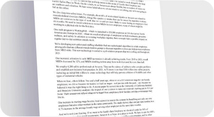 Despite what we’ve accomplished, it’s clear to me that we need a better vision for our employees’success. WehavealwayswantedtobeEarth’sMostCustomer-CentricCompany.Wewon’tchangethat.It’swhatgot us here. But I am committing us to an addition. We are going to be Earth’s Best Employer and Earth’s Safest Place to Work. In my upcoming role as Executive Chair, I’m going to focus on new initiatives. I’m an inventor. It’s what I enjoy the most and what I do best. It’s where I create the most value. I’m excited to work alongside the large teamof passionate people we have in Ops and help invent in this arena of Earth’s Best Employer and Earth’s Safest Place to Work. On the details, we at Amazon are always flexible, but on matters of vision we are stubborn and relentless. We have never failed when we set our minds to something, and we’re not going to fail at this either. Wedivedeepintosafetyissues. For example, about 40% of work-related injuries at Amazon are related to musculoskeletal disorders (MSDs), things like sprains or strains that can be caused by repetitive motions. MSDsarecommoninthetypeof work that we do and are more likely to occur during an employee’s first six months. We need to invent solutions to reduce MSDs for new employees, many of whom might be working in a physical role for the first time. OnesuchprogramisWorkingWell – whichwelaunchedto859,000employeesat350sitesacrossNorth AmericaandEuropein2020–wherewecoachsmallgroupsof employeesonbodymechanics,proactive wellness, and safety. In addition to reducing workplace injuries, these concepts have a positive impact on regular day-to-day activities outside work. We’re developing new automated staffing schedules that use sophisticated algorithms to rotate employees amongjobsthatusedifferentmuscle-tendongroupstodecreaserepetitivemotionandhelpprotectemployees fromMSDrisks.Thisnewtechnologyiscentraltoajobrotationprogramthatwe’rerollingoutthroughout 2021. Ourincreased attention to early MSD prevention is already achieving results. From 2019 to 2020, overall MSDsdecreasedby32%,andMSDsresultingintimeawayfromworkdecreasedbymorethanhalf. Weemploy6,200safetyprofessionals at Amazon. They use the science of safety to solve complex problems andestablish new industry best practices. In 2021, we’ll invest more than $300 million into safety projects, including an initial $66 million to create technology that will help prevent collisions of forklifts and other types of industrial vehicles. Whenwelead,othersfollow.Twoandahalf yearsago,whenweseta$15minimumwageforourhourly employees, we did so because we wanted to lead on wages – not just run with the pack – and because we believed it was the right thing to do. A recent paper by economists at the University of California-Berkeley and Brandeis University analyzed the impact of our decision to raise our minimum starting pay to $15 per hour. Their assessment reflects what we’ve heard from employees, their families, and the communities they live in. Ourincrease in starting wage boosted local economies across the country by benefiting not only our own employees but also other workers in the same community. The study showed that our pay raise resulted in a 4.7%increase in the average hourly wage among other employers in the same labor market. Andwe’renotdoneleading.If wewanttobeEarth’sBestEmployer,weshouldn’tsettlefor94%of employees saying they would recommend Amazon to a friend as a place to work. We have to aim for 100%. Andwe’lldothatbycontinuingtoleadonwages,onbenefits,onupskillingopportunities, and in other waysthat we will figure out over time. If any shareowners are concerned that Earth’s Best Employer and Earth’s Safest Place to Work might dilute our focus on Earth’s Most Customer-Centric Company, let me set your mind at ease. Think of it this way. If we can operate two businesses as different as consumer ecommerce and AWS, and do both at the highest level, we can certainly do the same with these two vision statements. In fact, I’m confident they will reinforce each other.